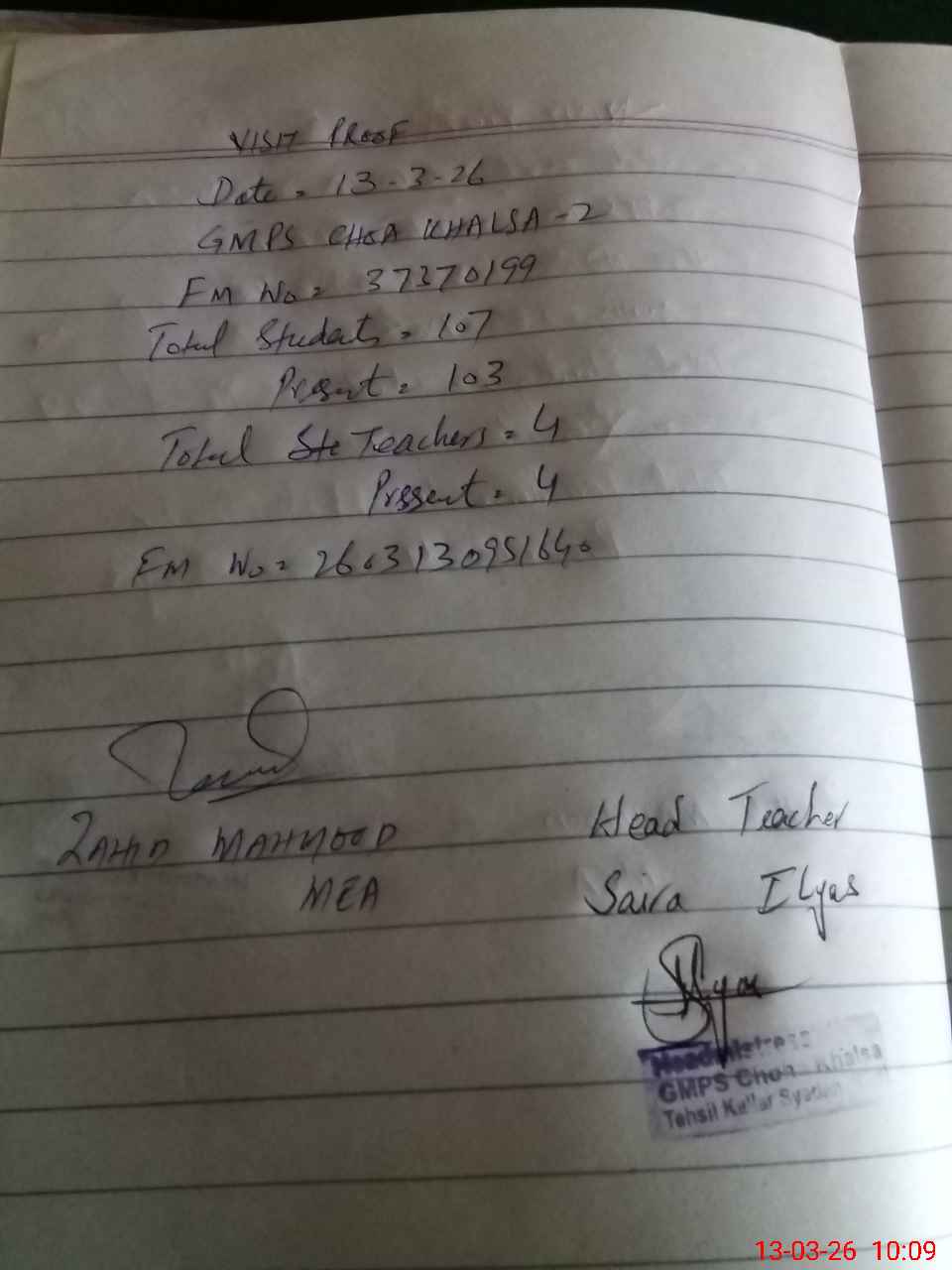 | Attendance Register | Head Teacher | MEA with School | Visit Proof |