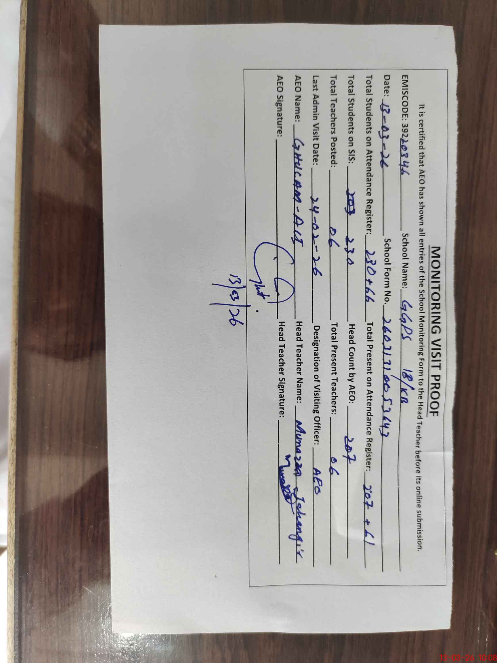 | Certified that this School was Inspected by the Undersigned MEA/DMO Today and the Information Stated Above is as Per Record. | |||||