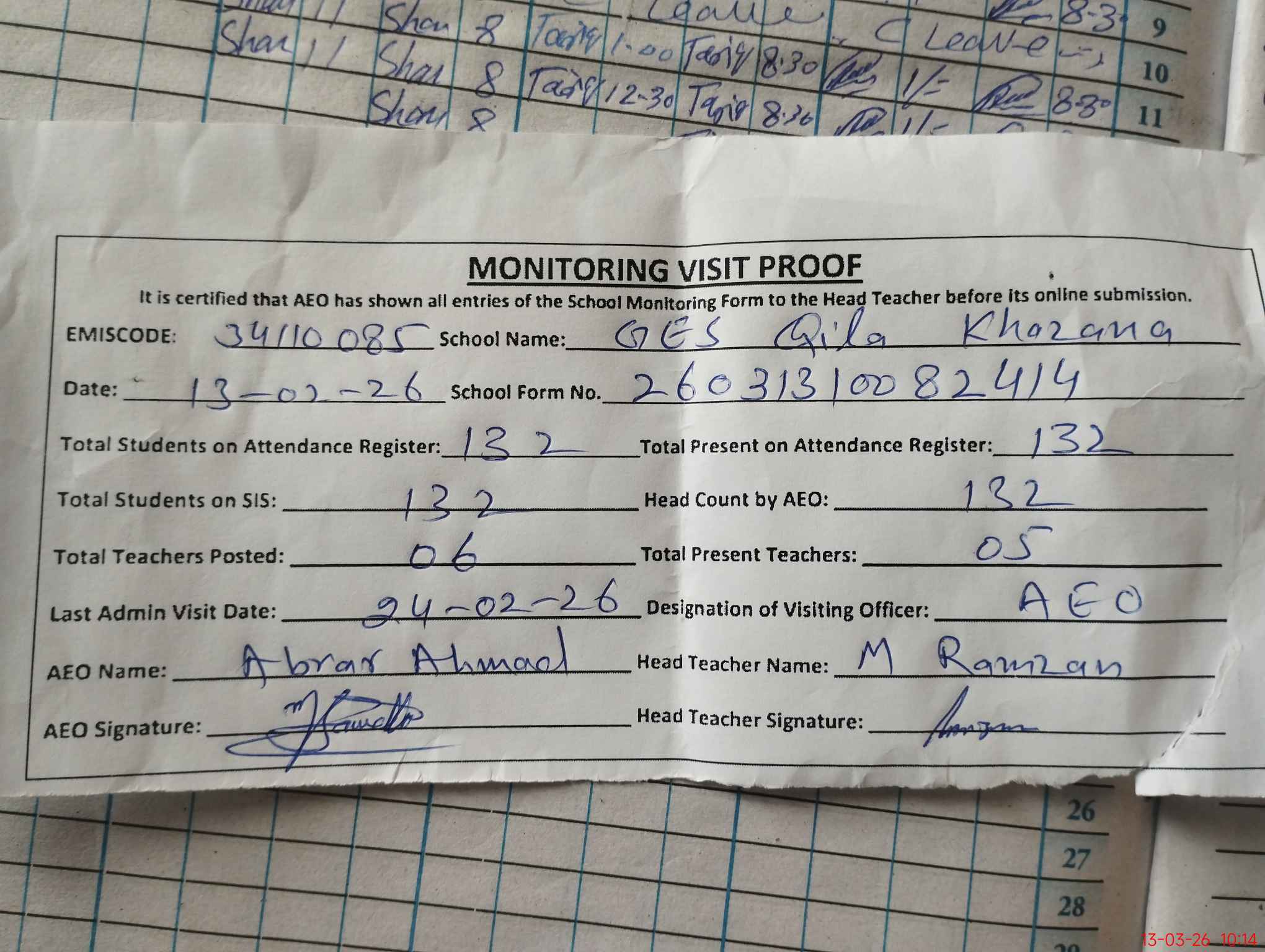 | Attendance Register | Head Teacher | MEA with School | Visit Proof |