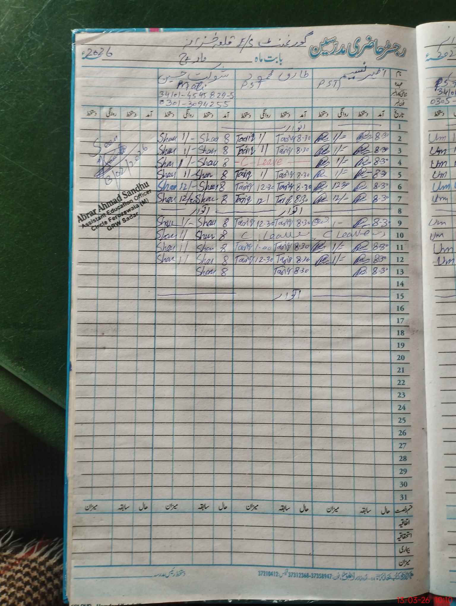 | Name: MU**** Ra**** Designation: (School Headmaster's/Headmistress's) EST Phone/Cell Number: 03**** |