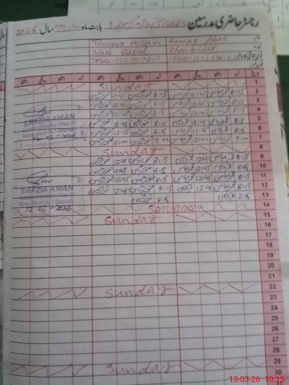 | CNIC | Full Name | Designation | R/C | Absence During Last Calender Month |