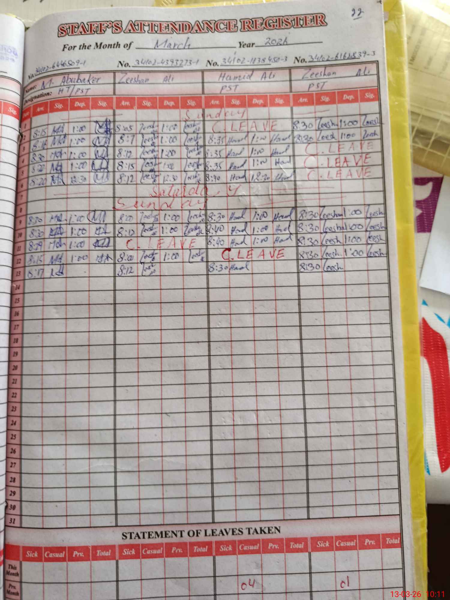 | Leave | Duty | Absent | Maternity | Medical | Ex- Pak |