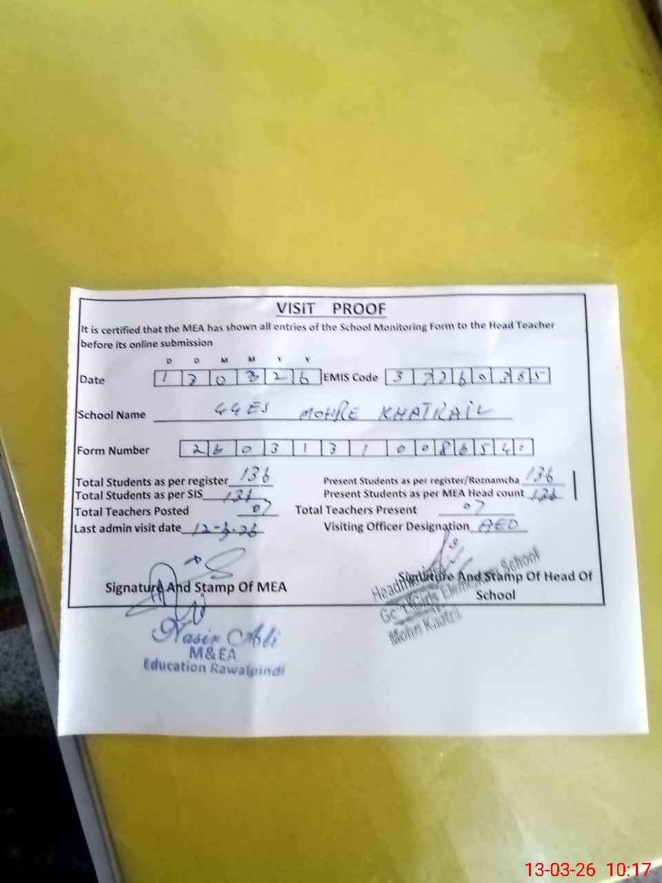 | Attendance Register | Head Teacher | MEA with School | Visit Proof |