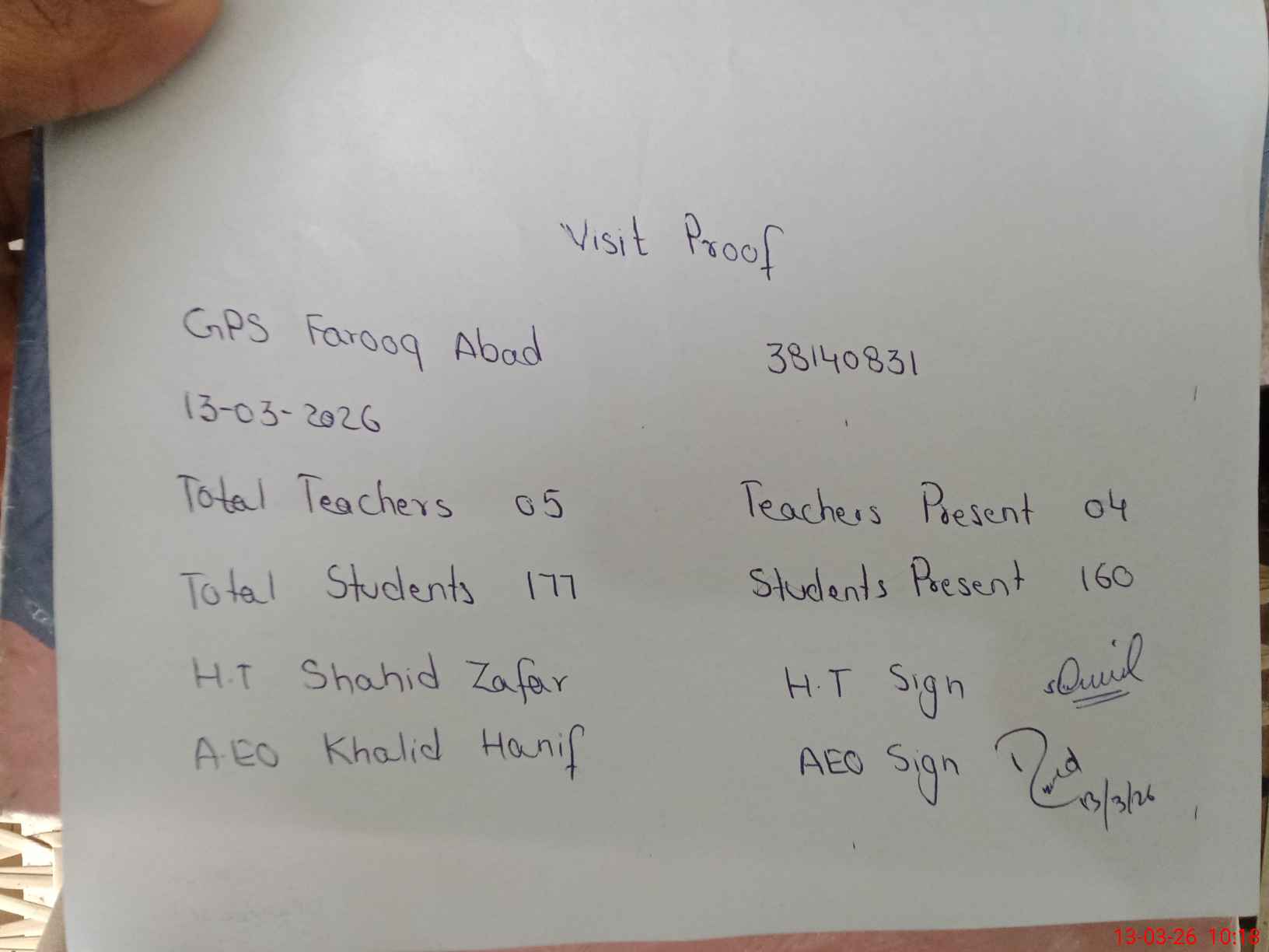 | Attendance Register | Head Teacher | MEA with School | Visit Proof |
