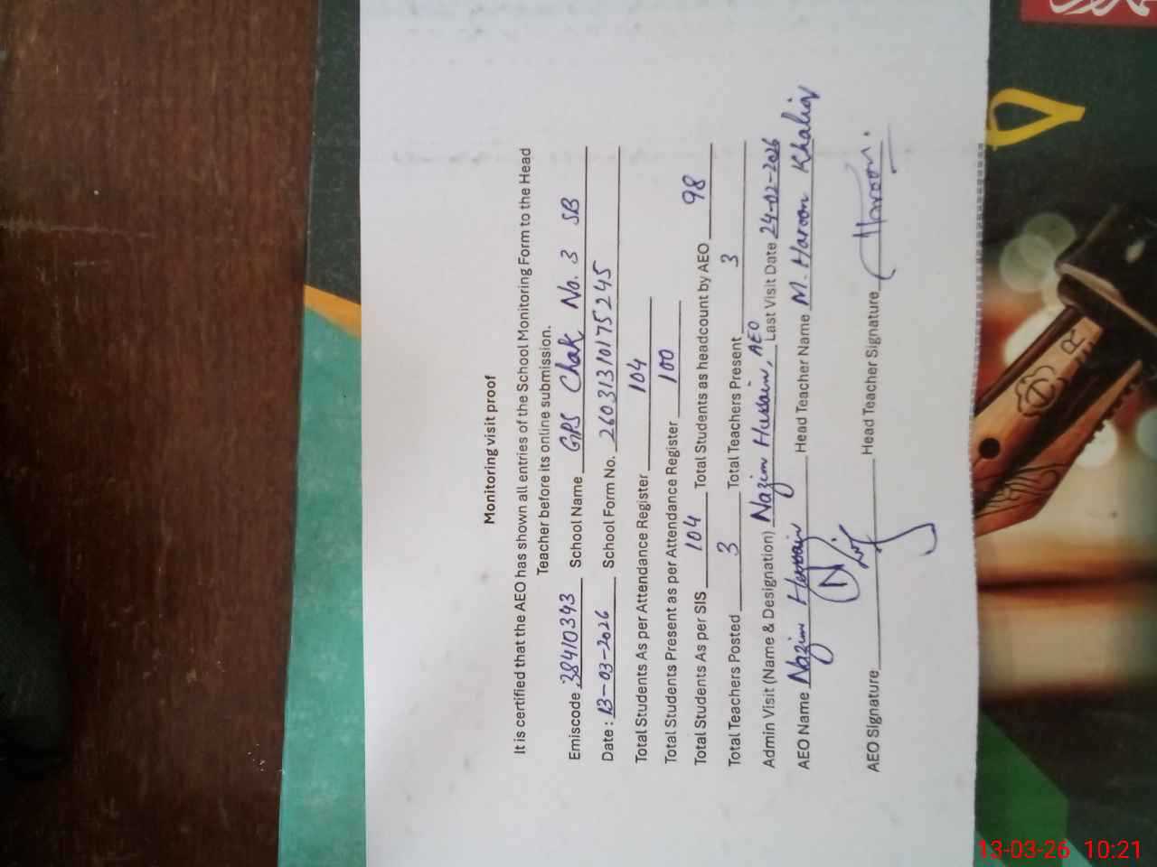 | EMIS Code: 38410343 | Name of School: GPS CHAK NO.3 SB | |||