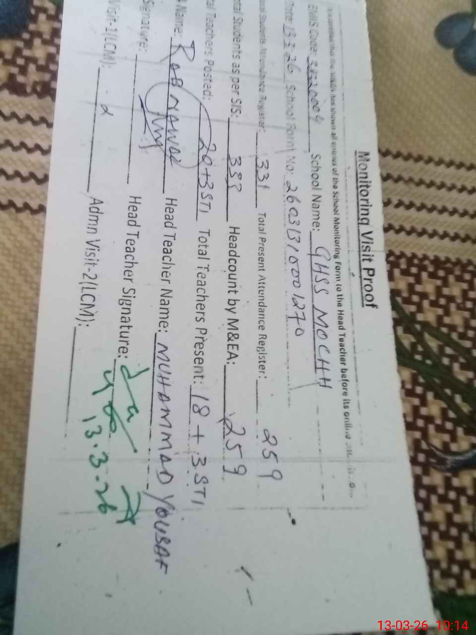 | Attendance Register | Head Teacher | MEA with School | Visit Proof |