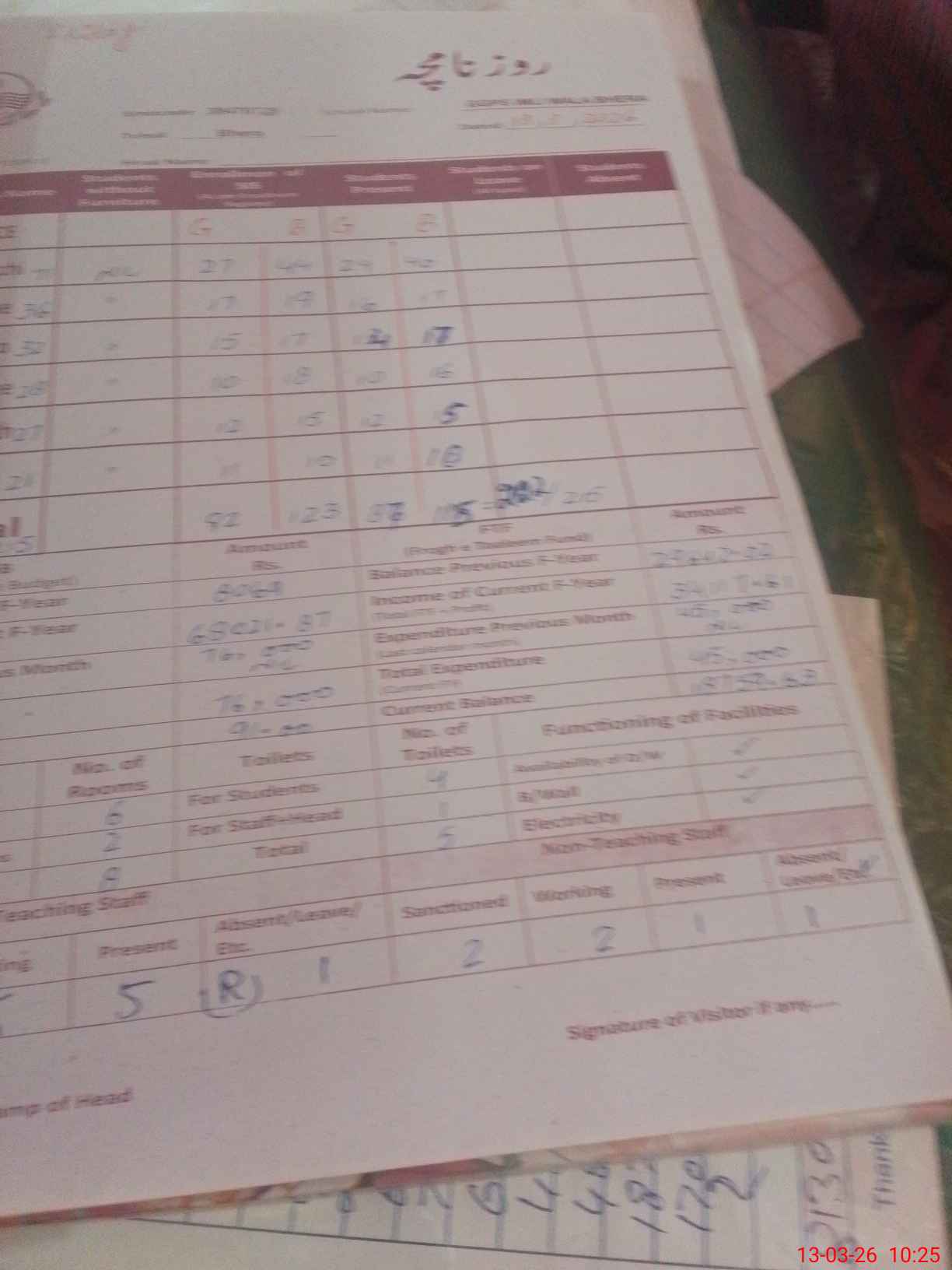 | Total no. of Classrooms: 13 No. of Classrooms Used for Teaching: 7 No. of Classrooms Storing Old Furniture, FTBs, etc: 0Comments if Any: 0 |