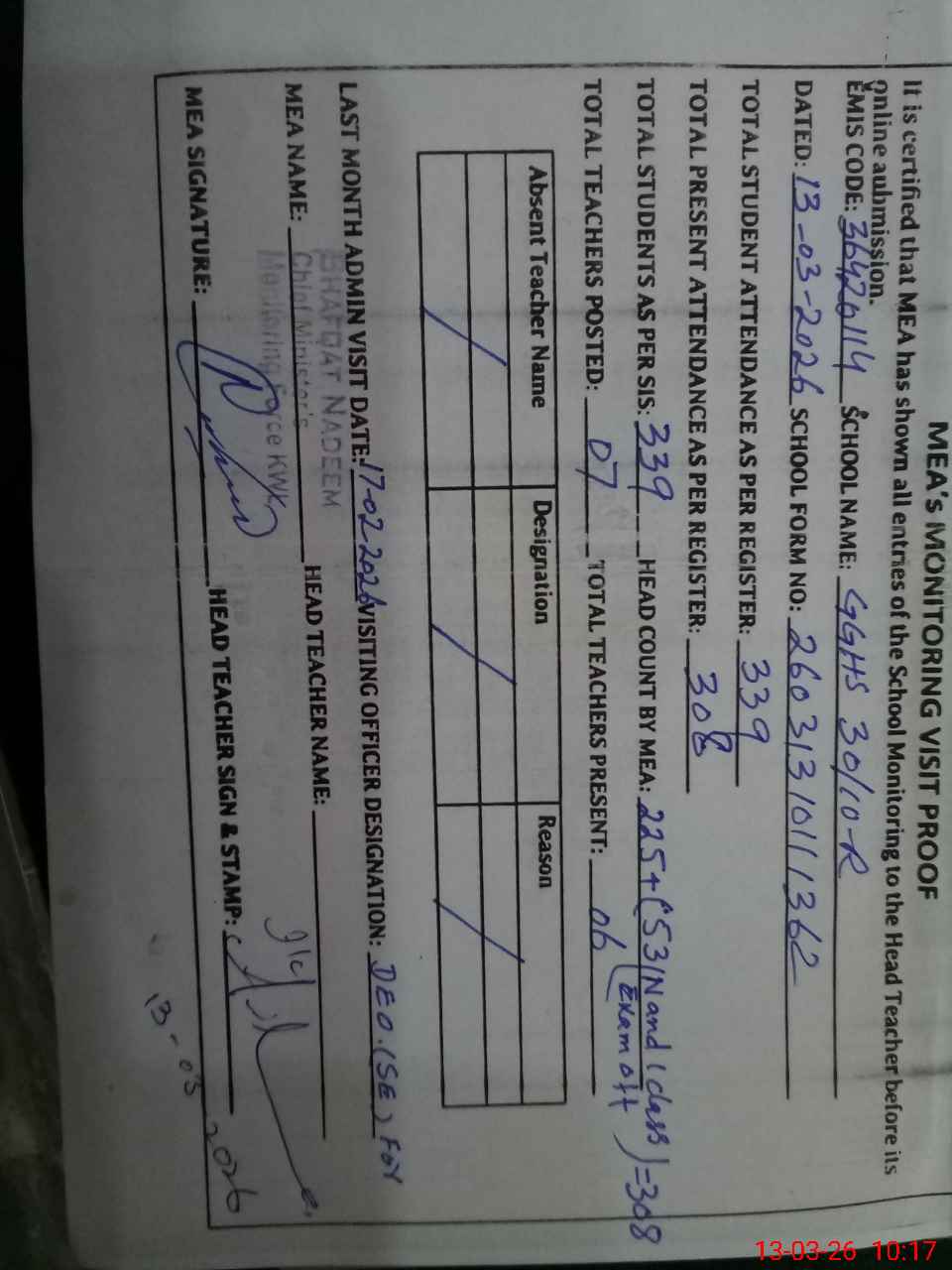 | Remarks (Use Separate Page if Required): 1. NSB and FTF record not shown 2. Narsury and 1 class exam off attendence taken from roznamcha 3. 03 STI present in the school | |||||