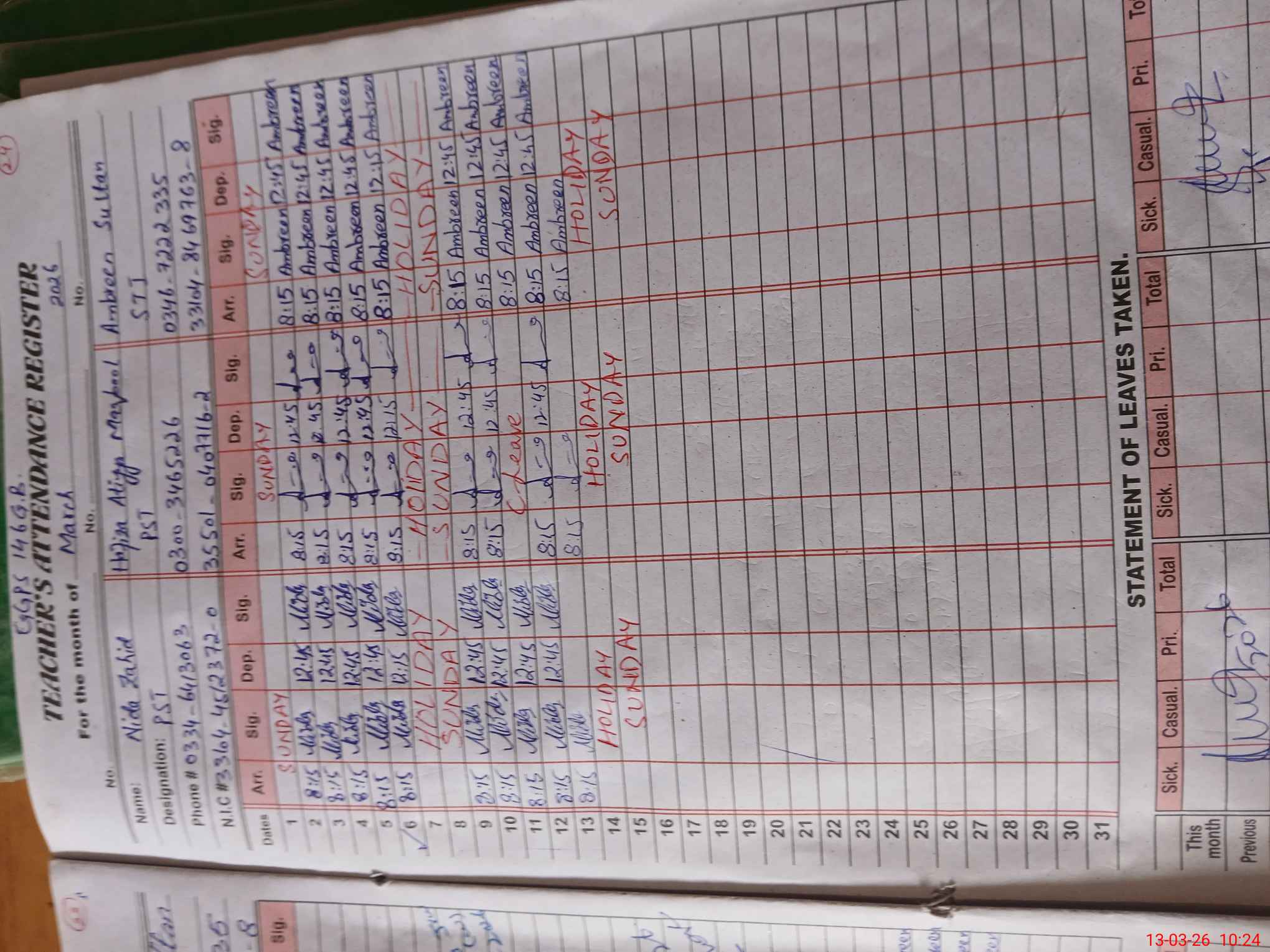 | CNIC | Full Name | Designation | R/C | Absence During Last Calender Month |