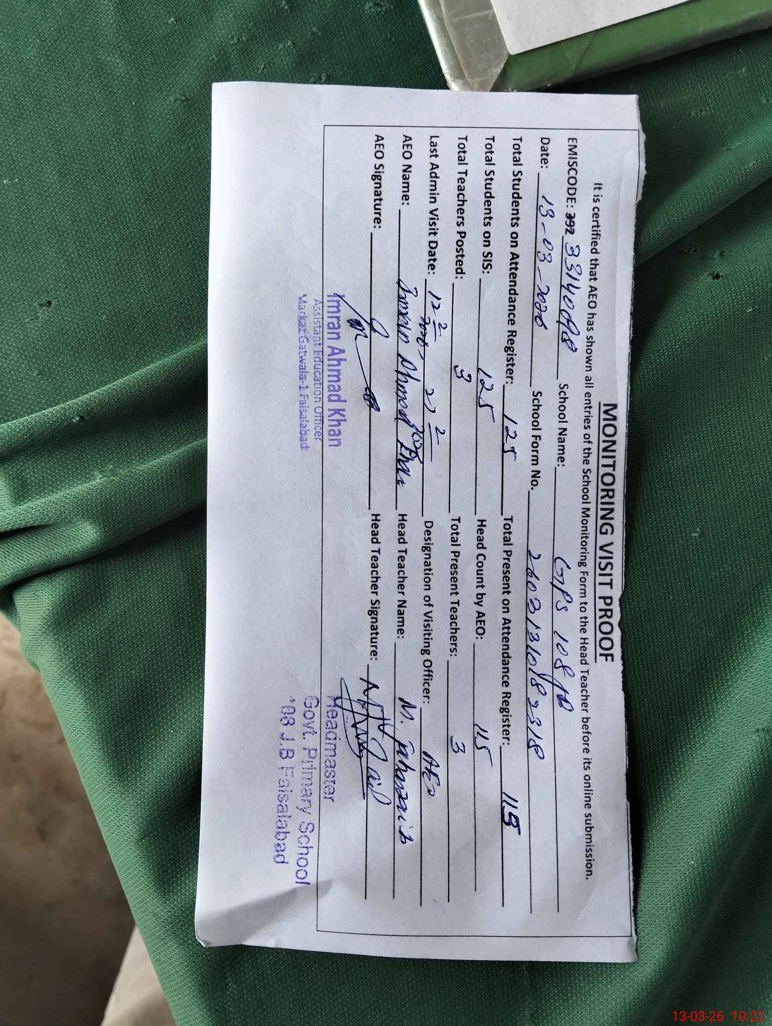 | Monitoring Date: 13-03-2026 | Start Time: 13-03-2026 10:06 AM | End Time: 13-03-2026 10:29 AM | Name of MEA: Im**** Ah**** Kh**** | |