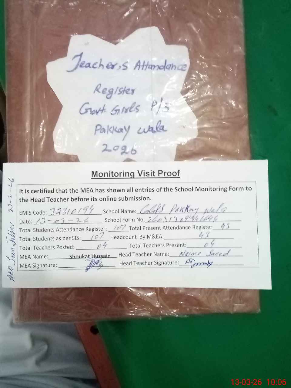 | Attendance Register | Head Teacher | MEA with School | Visit Proof |