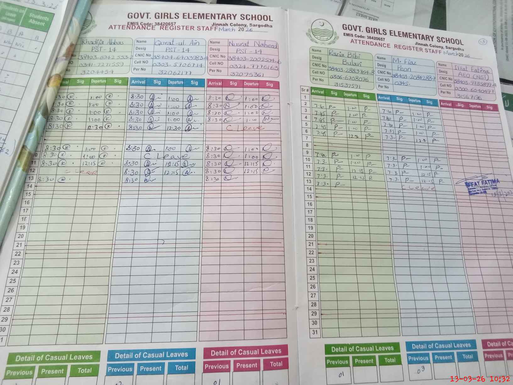 | CNIC | Full Name | Designation | R/C | Absence during last cal. month |