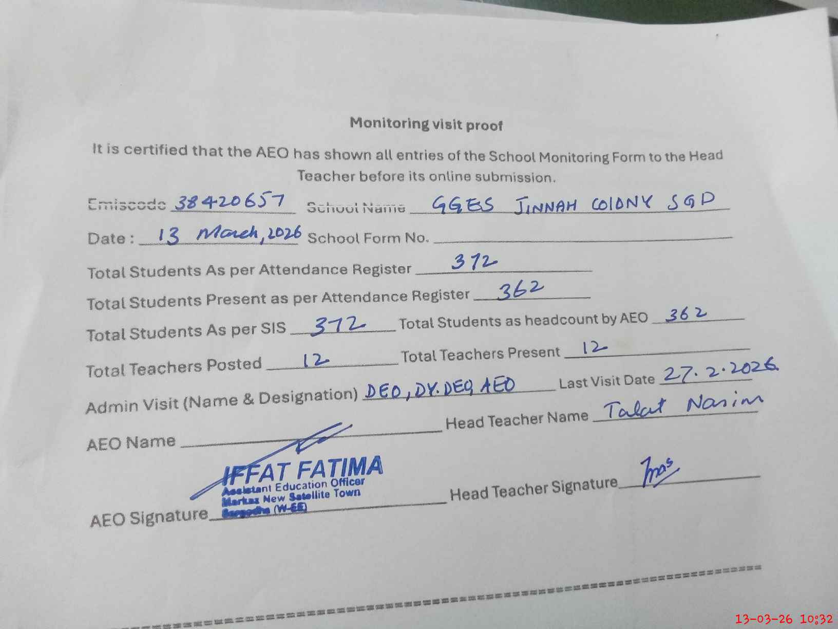| Attendance Register | Head Teacher | MEA with School | Visit Proof |