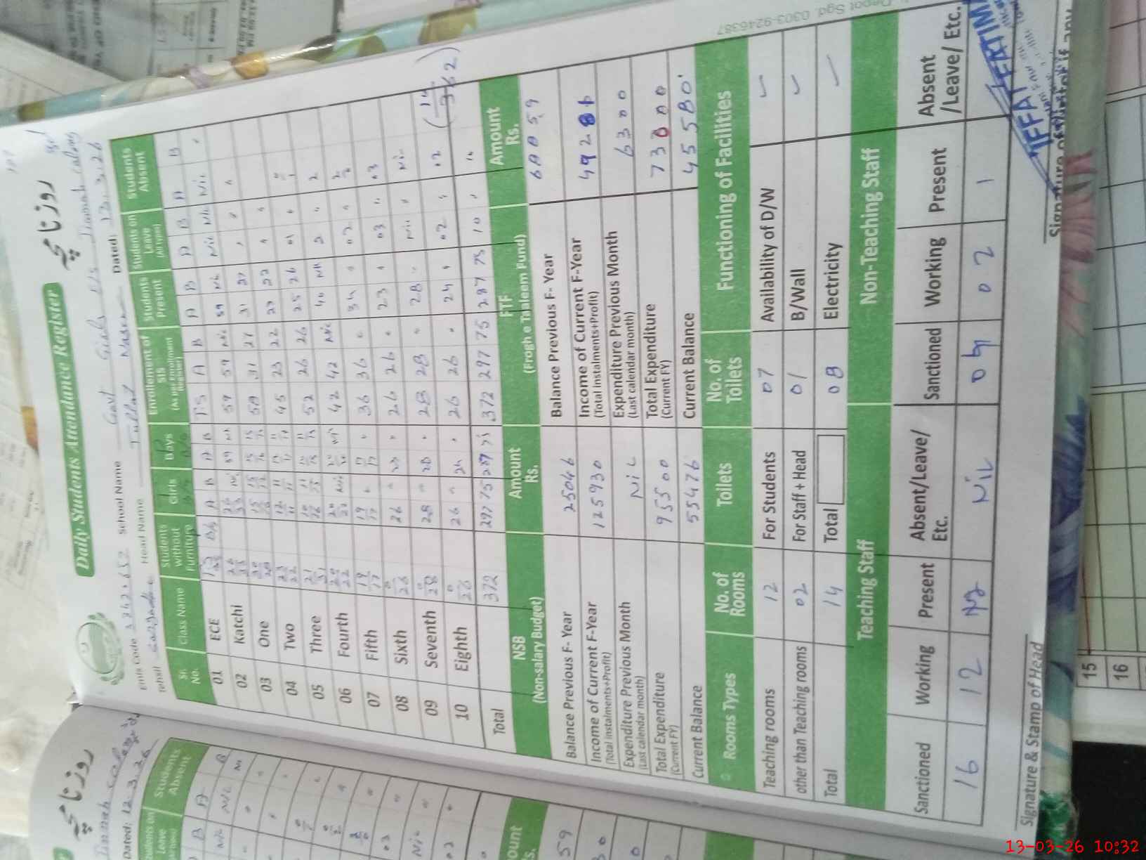 | Total no. of Classrooms: 14 No. of Classrooms Used for Teaching: 12 No. of Classrooms Storing Old Furniture, FTBs, etc: 0Comments if Any: 0 |