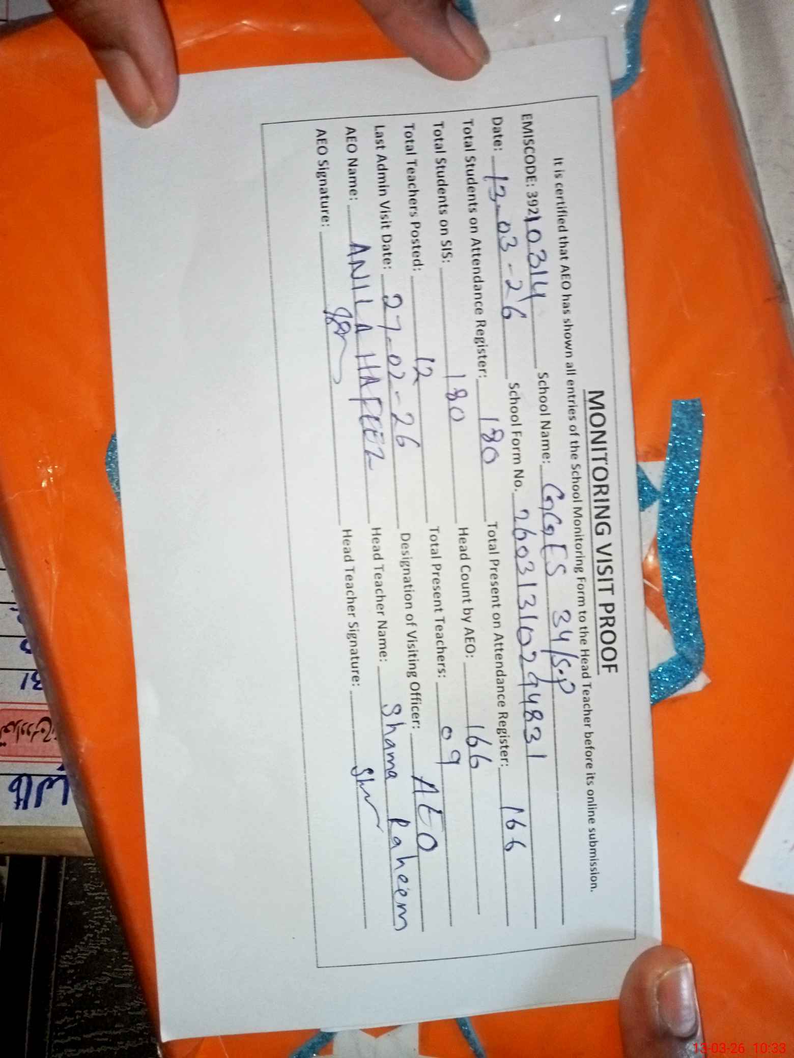 | Attendance Register | Head Teacher | MEA with School | Visit Proof |
