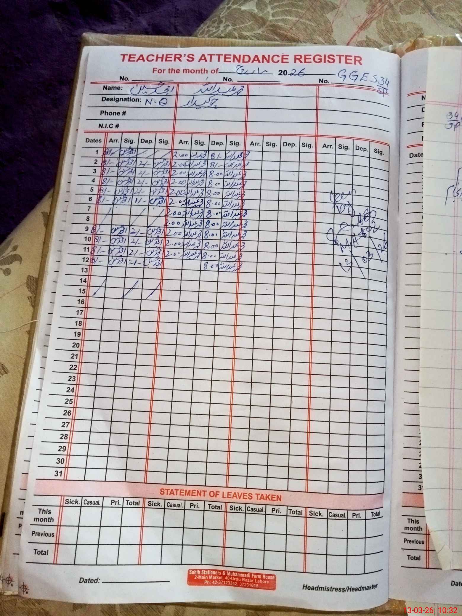 | Name: AA**** JA**** MU**** Designation: (School Headmaster's/Headmistress's) SST (GENERAL) Phone/Cell Number: 03**** |