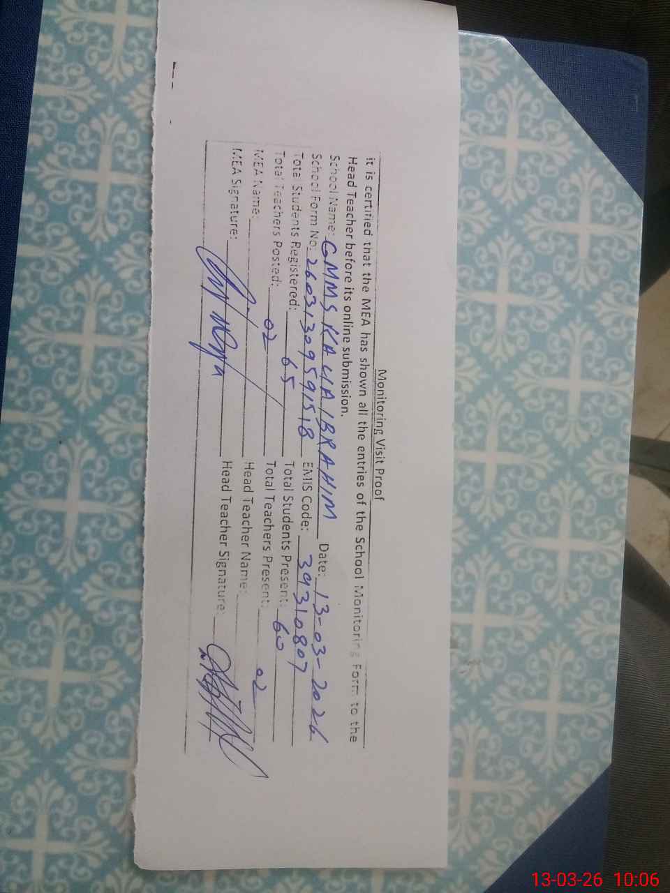 | Certified that this School was Inspected by the Undersigned MEA/DMO Today and the Information Stated Above is as Per Record. | |||||