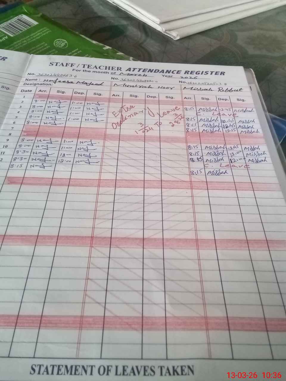 | Leave | Duty | Absent | Maternity | Medical | Ex- Pak |