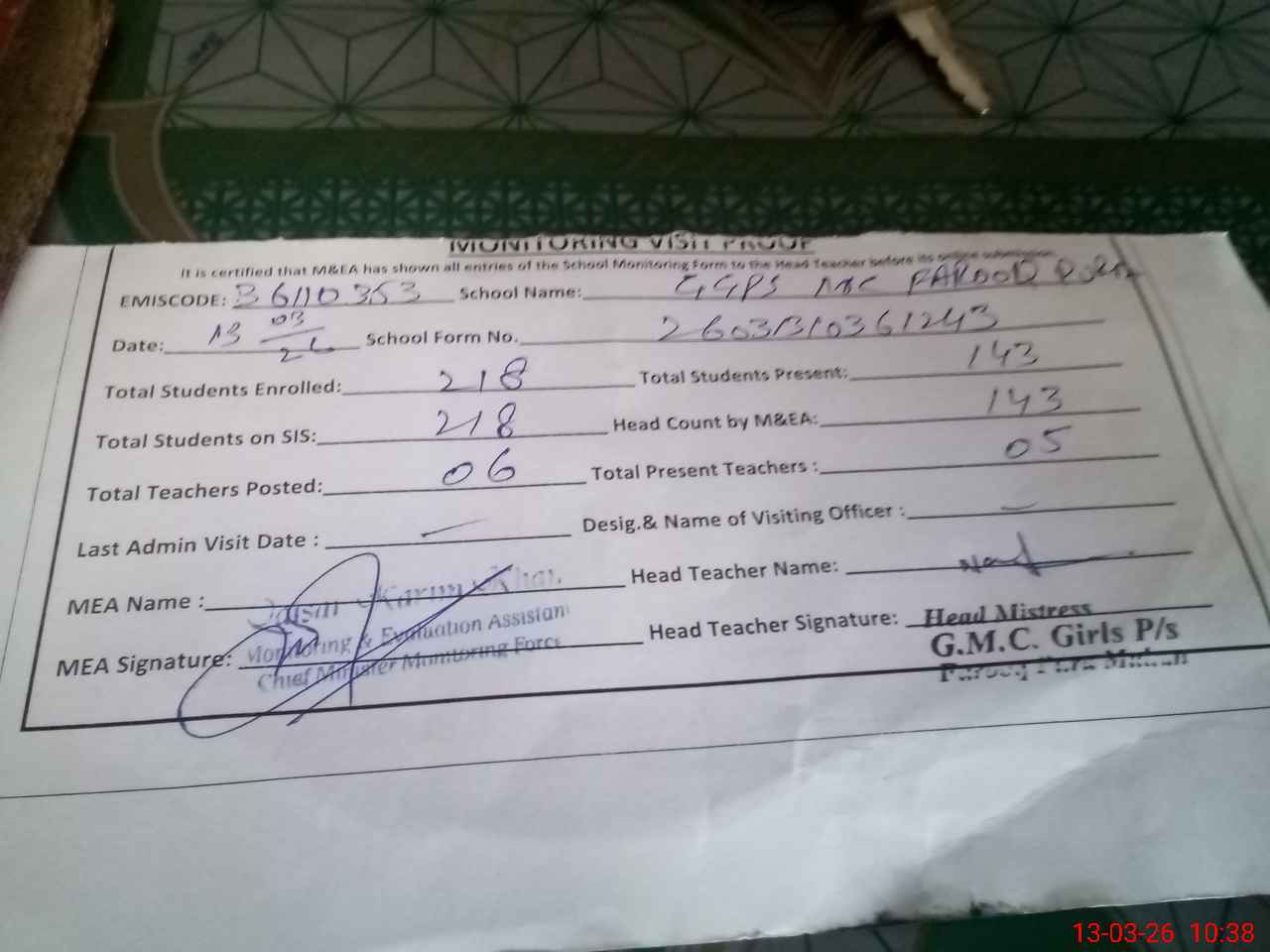 | Attendance Register | Head Teacher | MEA with School | Visit Proof |