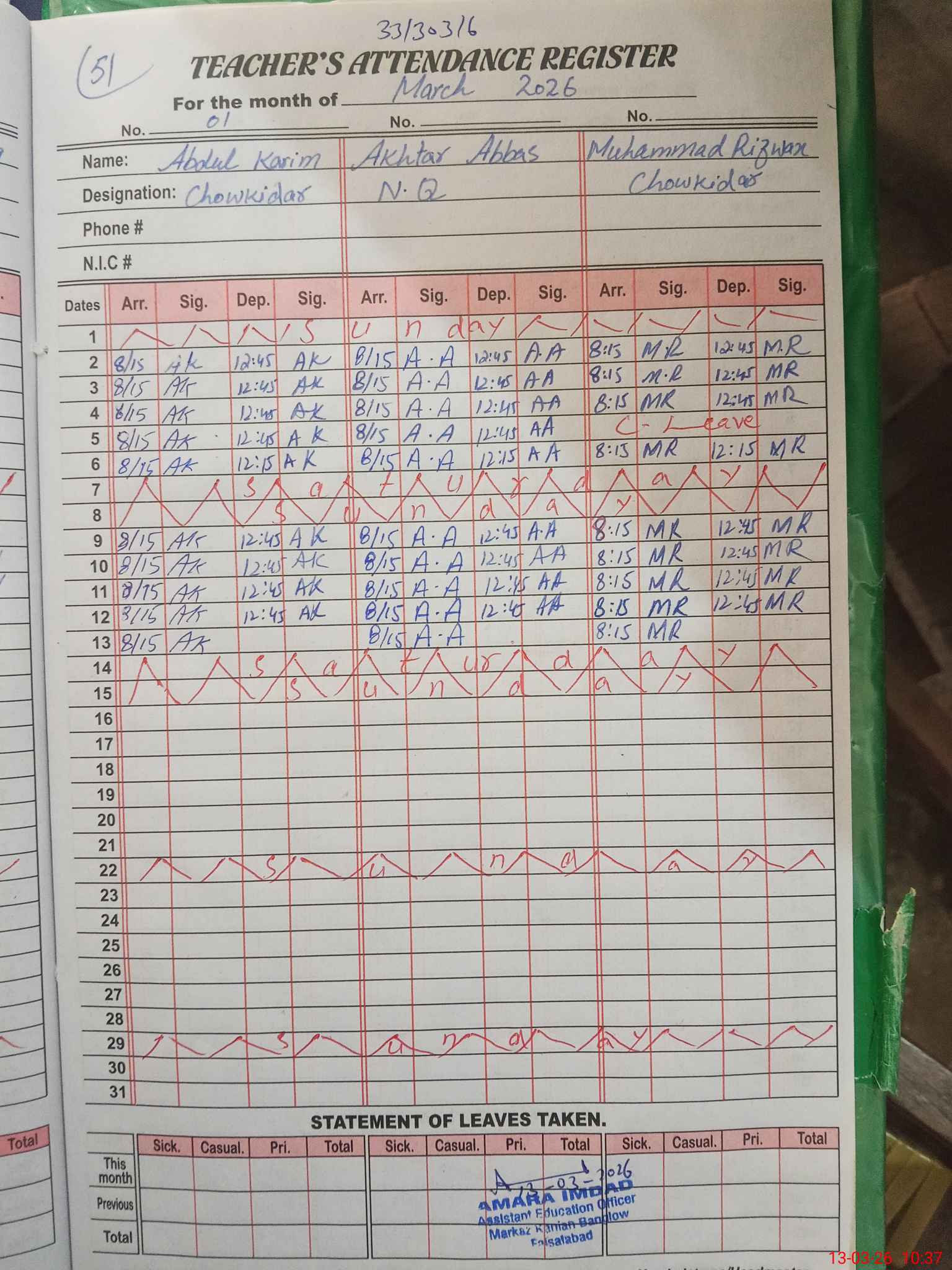 | 33**** | Ma**** Sh**** | PST Arts | Regular | 0 | 0 | 0 | 0 | 0 | 0 | 0 | 0 | 0 | Maternity |