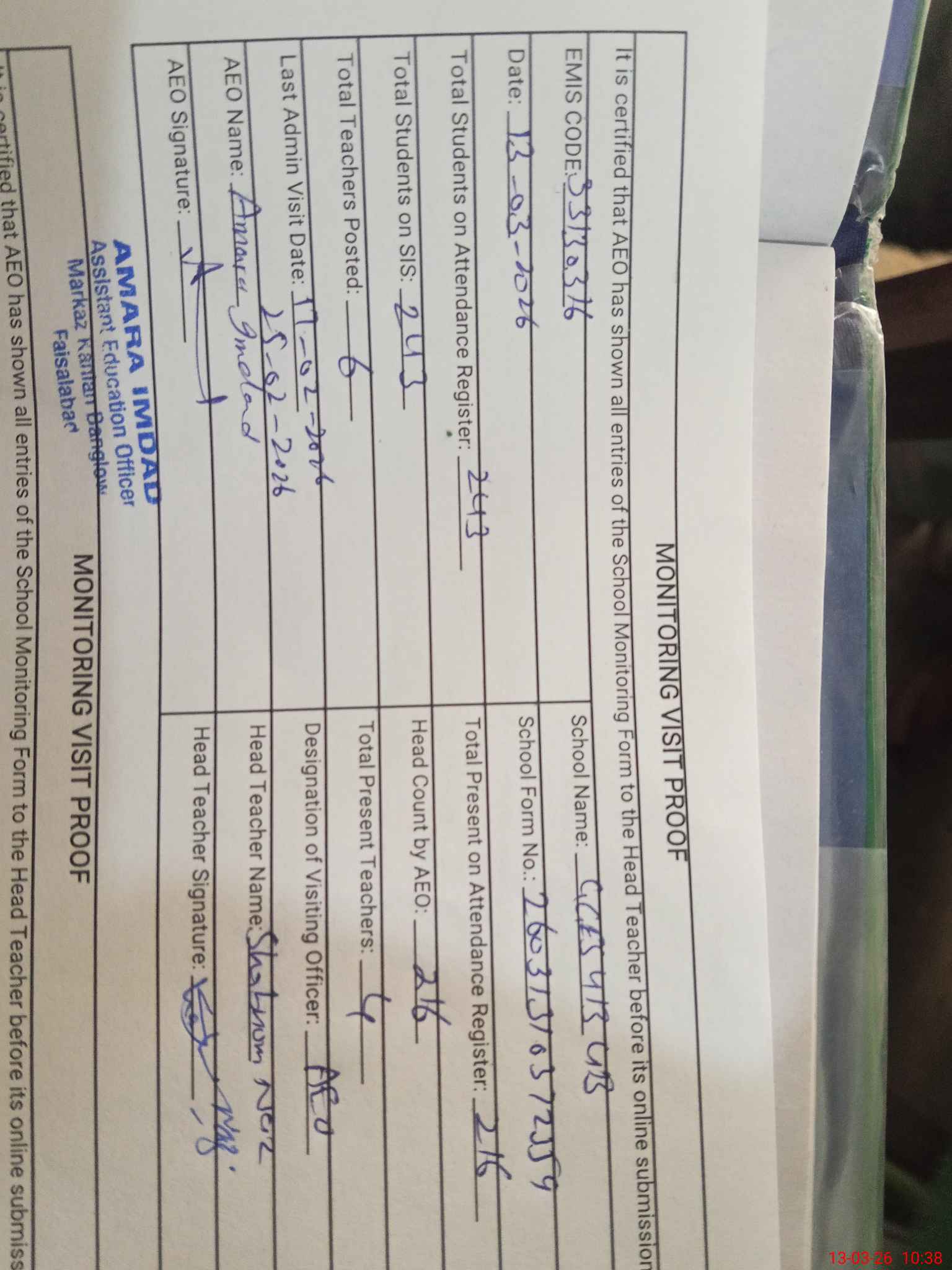 | Attendance Register | Head Teacher | MEA with School | Visit Proof |