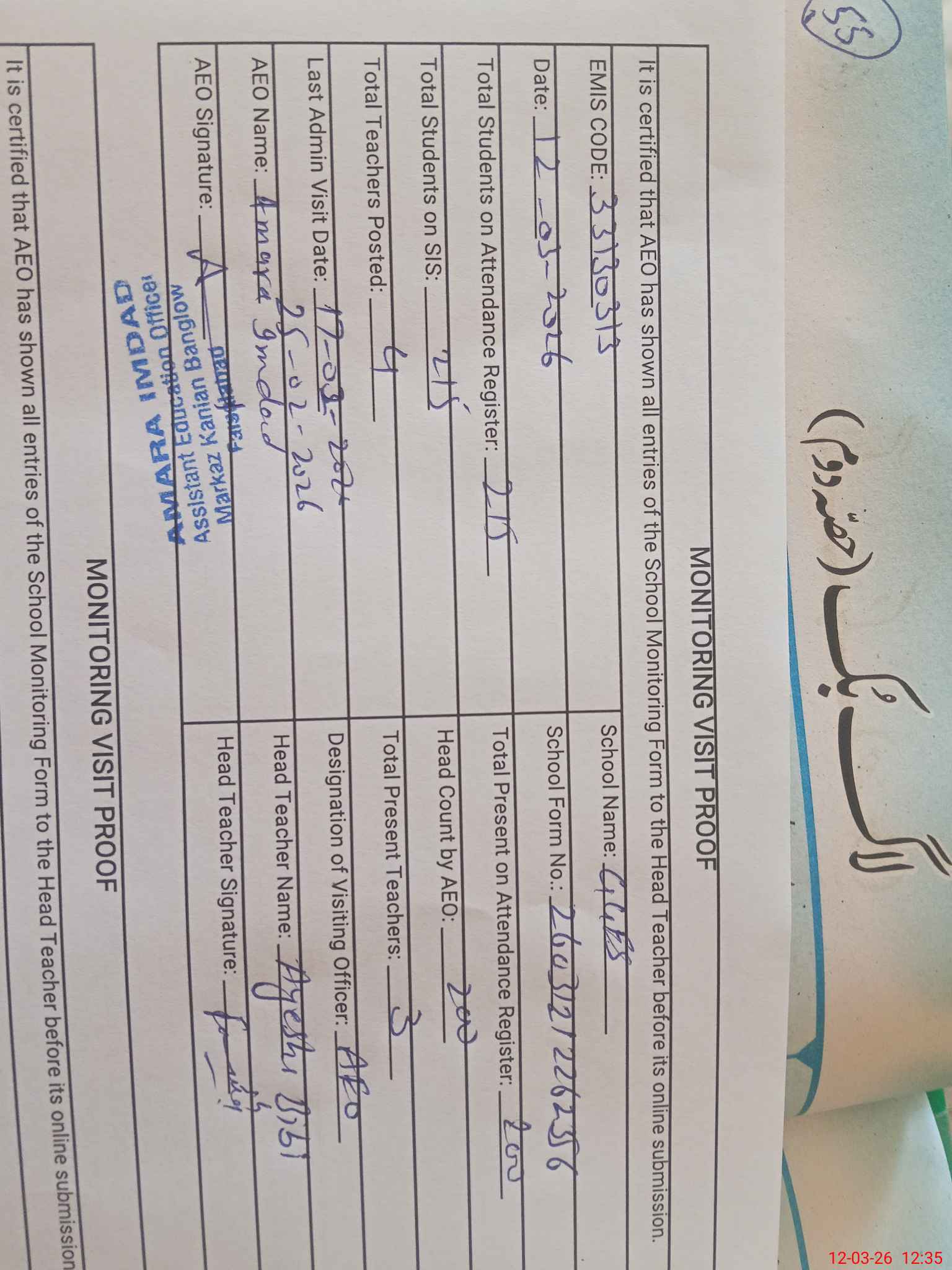| Certified that this School was Inspected by the Undersigned MEA/DMO Today and the Information Stated Above is as Per Record. | |||||