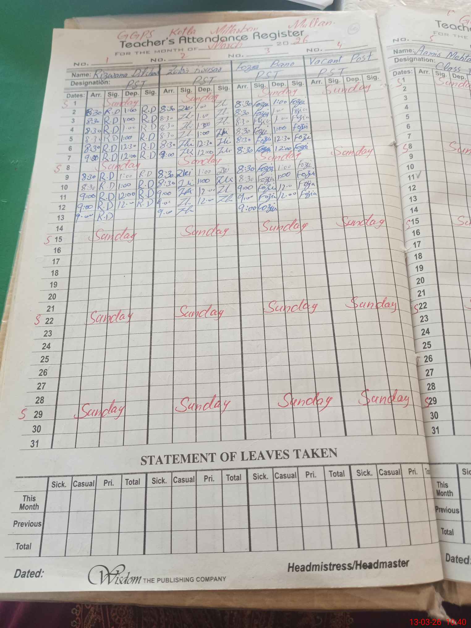 | Leave | Duty | Absent | Maternity | Medical | Ex- Pak |