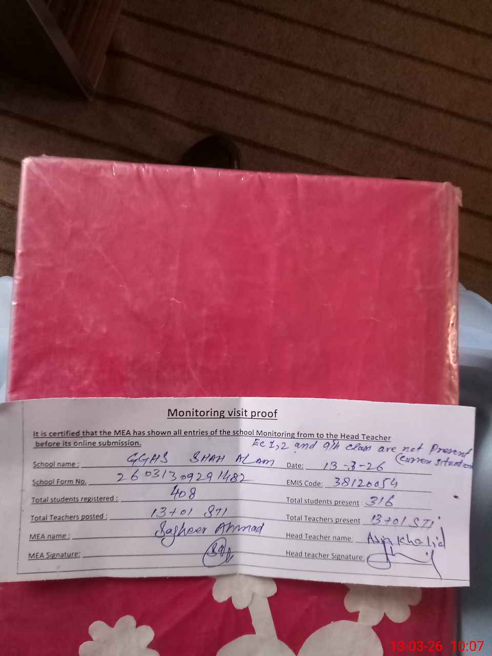 | Attendance Register | Head Teacher | MEA with School | Visit Proof |
