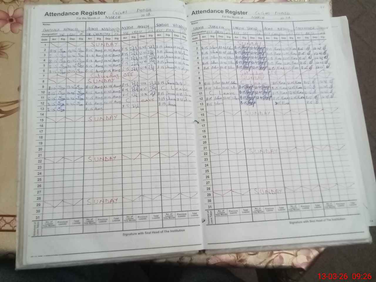 | No. of Students Present - Female | 0 | 14 | 16 | 23 | 20 | 26 | 19 | 39 | 45 | 46 | 34 | 33 | 326 | |||