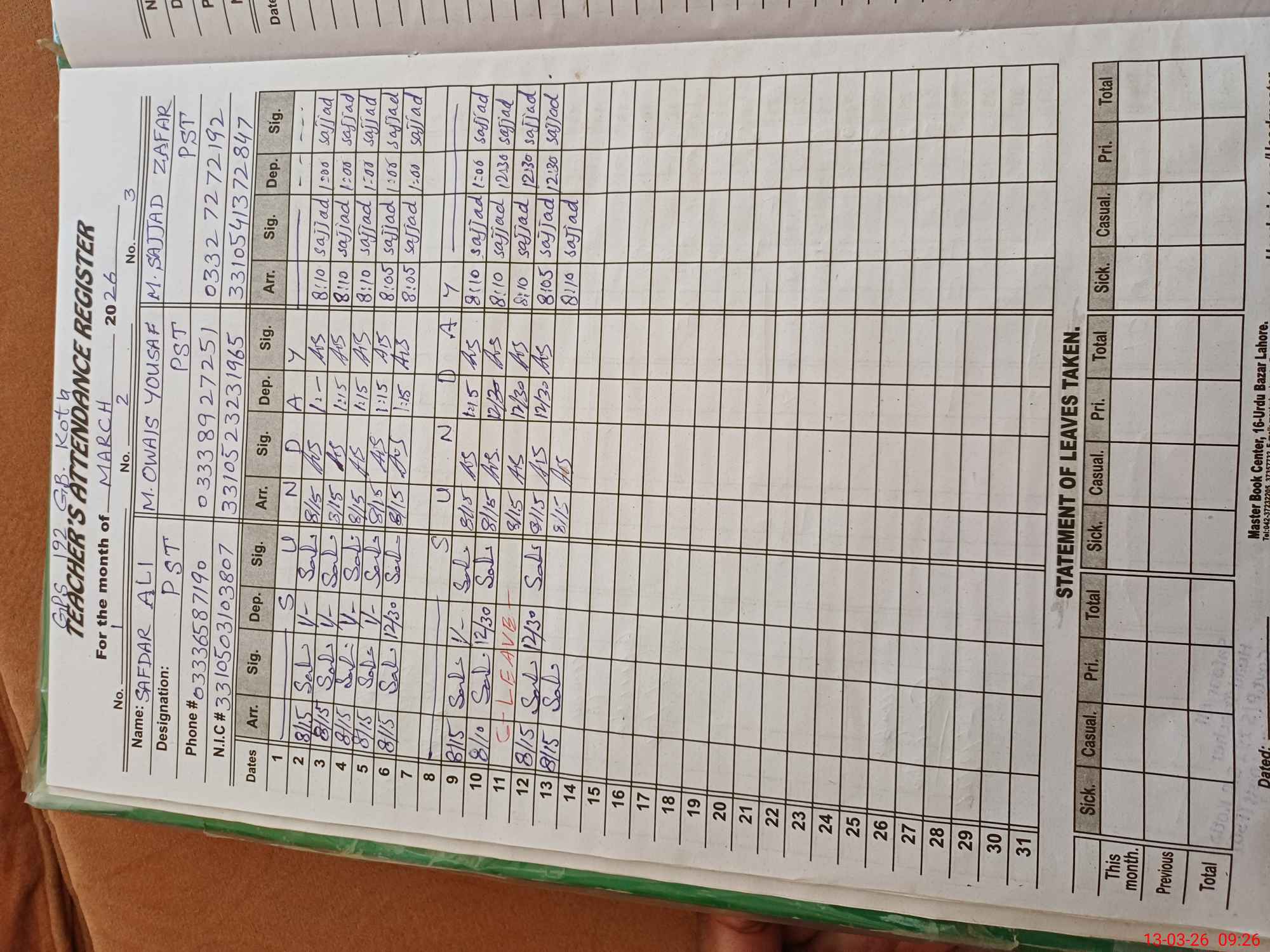 | Name: SA**** AL**** Designation: (School Headmaster's/Headmistress's) PST Phone/Cell Number: 03**** |