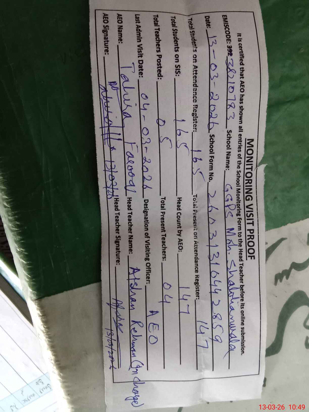 | Certified that this School was Inspected by the Undersigned MEA/DMO Today and the Information Stated Above is as Per Record. | |||||