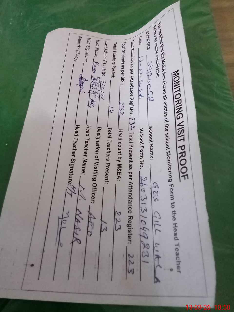 | Attendance Register | Head Teacher | MEA with School | Visit Proof |