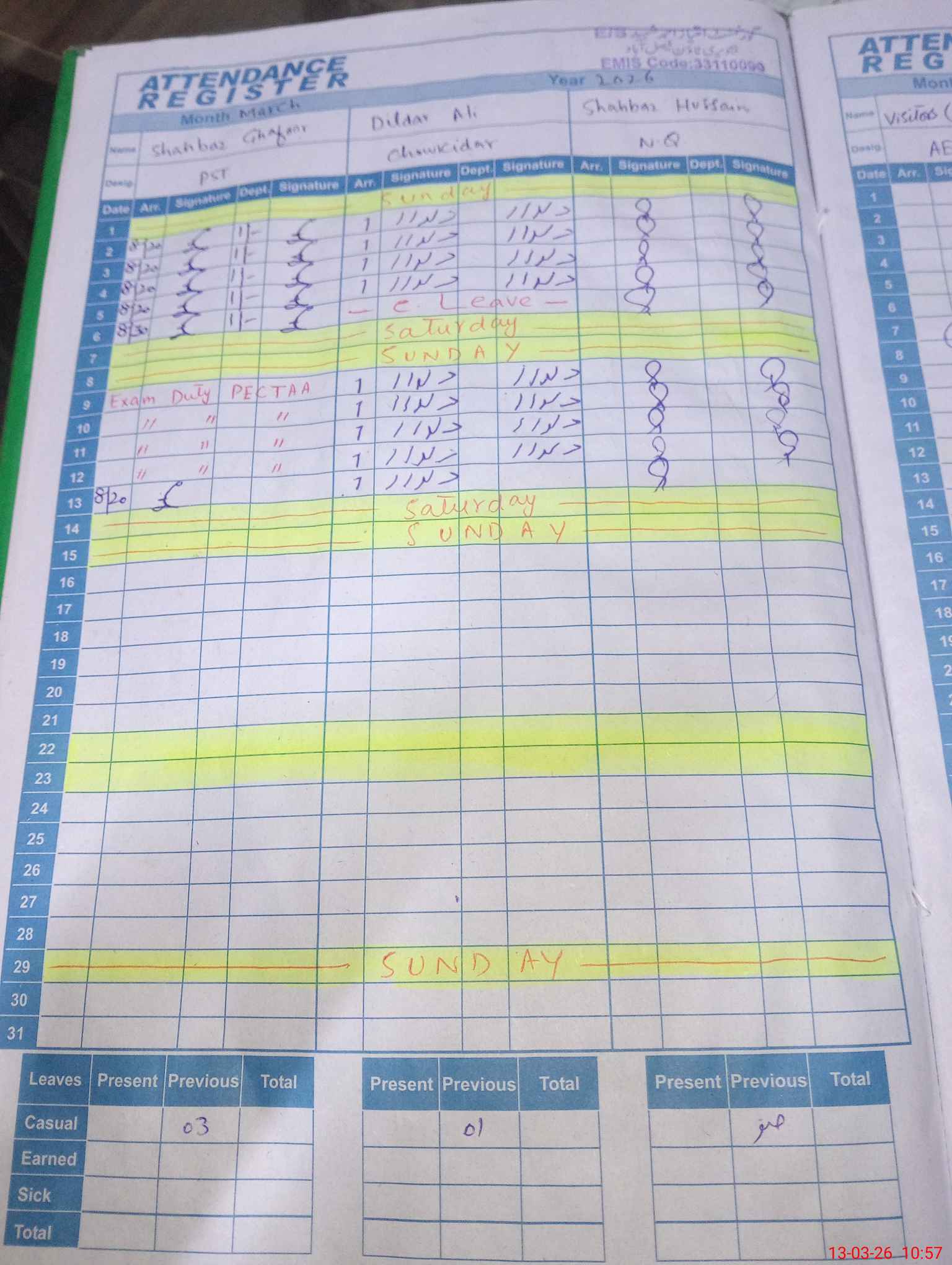 | Leave | Duty | Absent | Maternity | Medical | Ex- Pak |