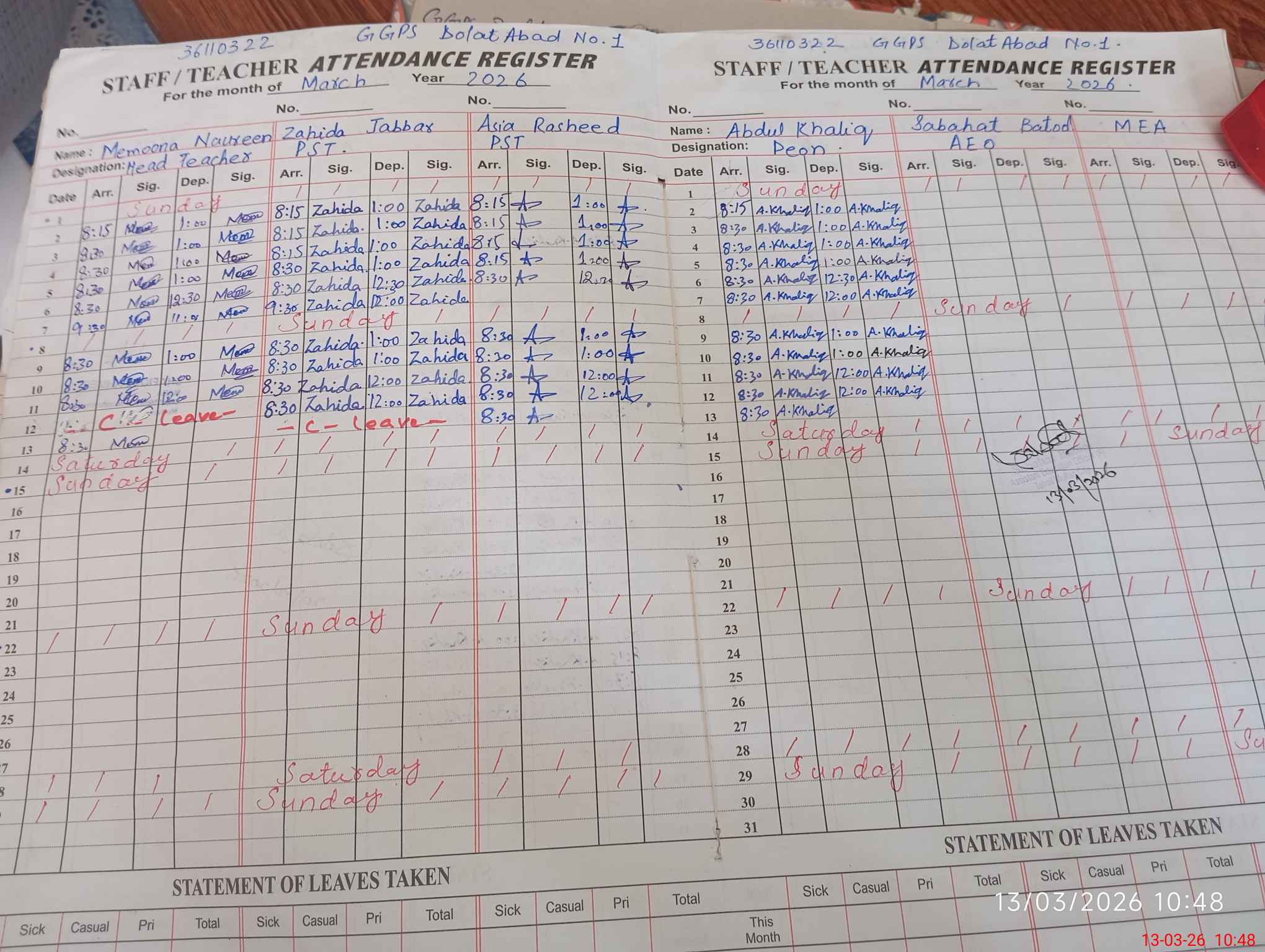 | Leave | Duty | Absent | Maternity | Medical | Ex- Pak |
