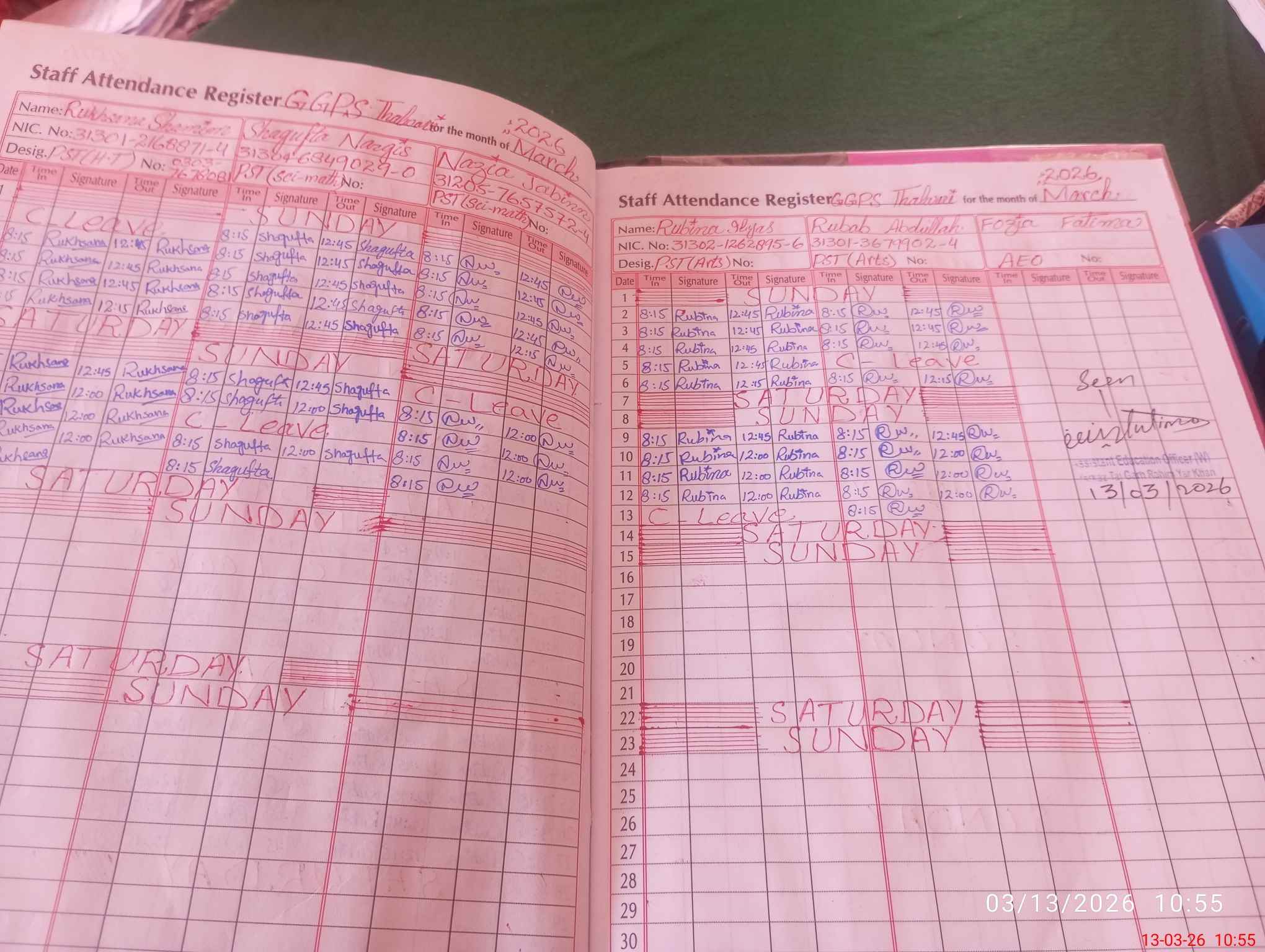 | CNIC | Full Name | Designation | R/C | Absence During Last Calender Month |