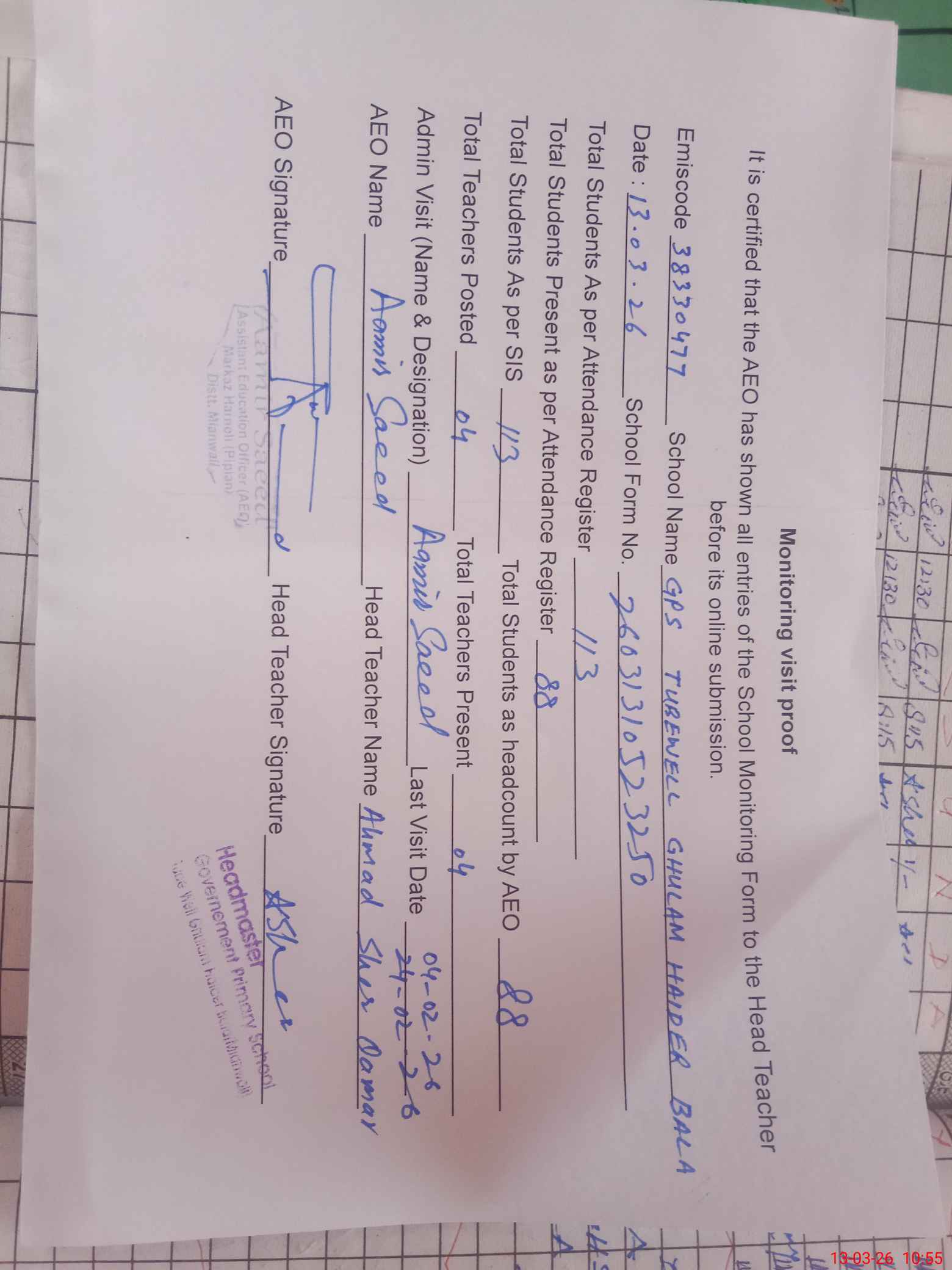 | Name: Ah**** Sh**** Qa**** Designation: (School Headmaster's/Headmistress's) PST Phone/Cell Number: 03**** |
