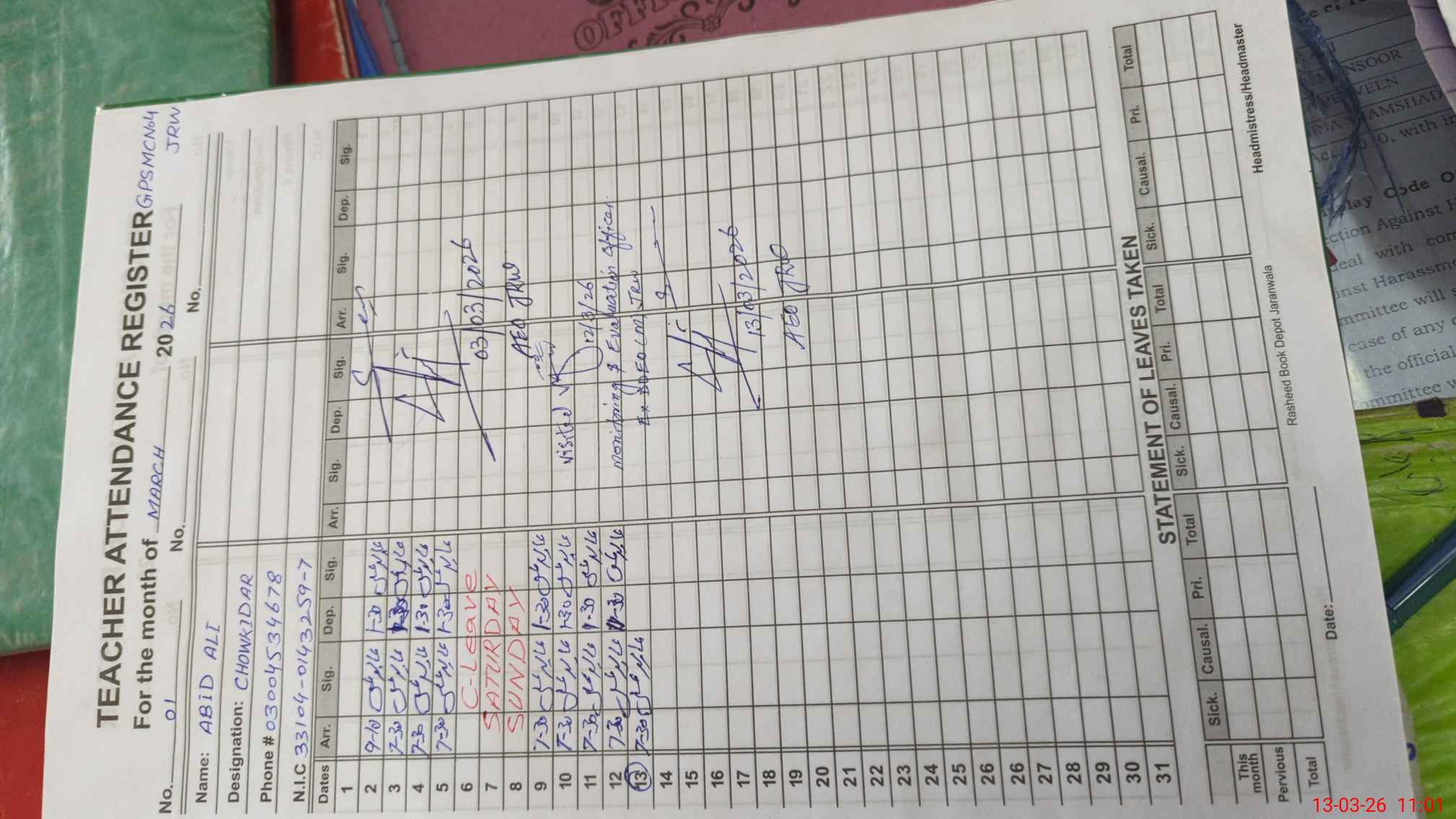 | Name: AK**** AL**** Designation: (School Headmaster's/Headmistress's) PST Phone/Cell Number: 03**** |