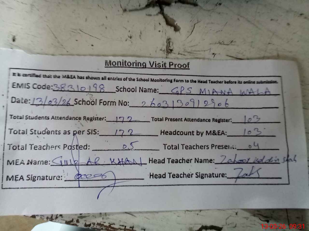| Attendance Register | Head Teacher | MEA with School | Visit Proof |