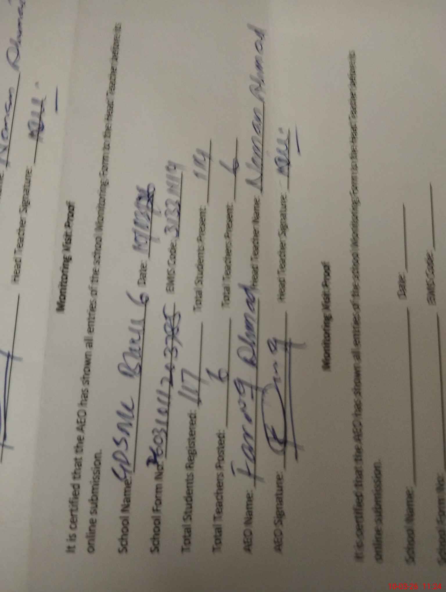 | Name: Na**** Ah**** Kh**** Designation: (School Headmaster's/Headmistress's) PST Phone/Cell Number: 03**** |