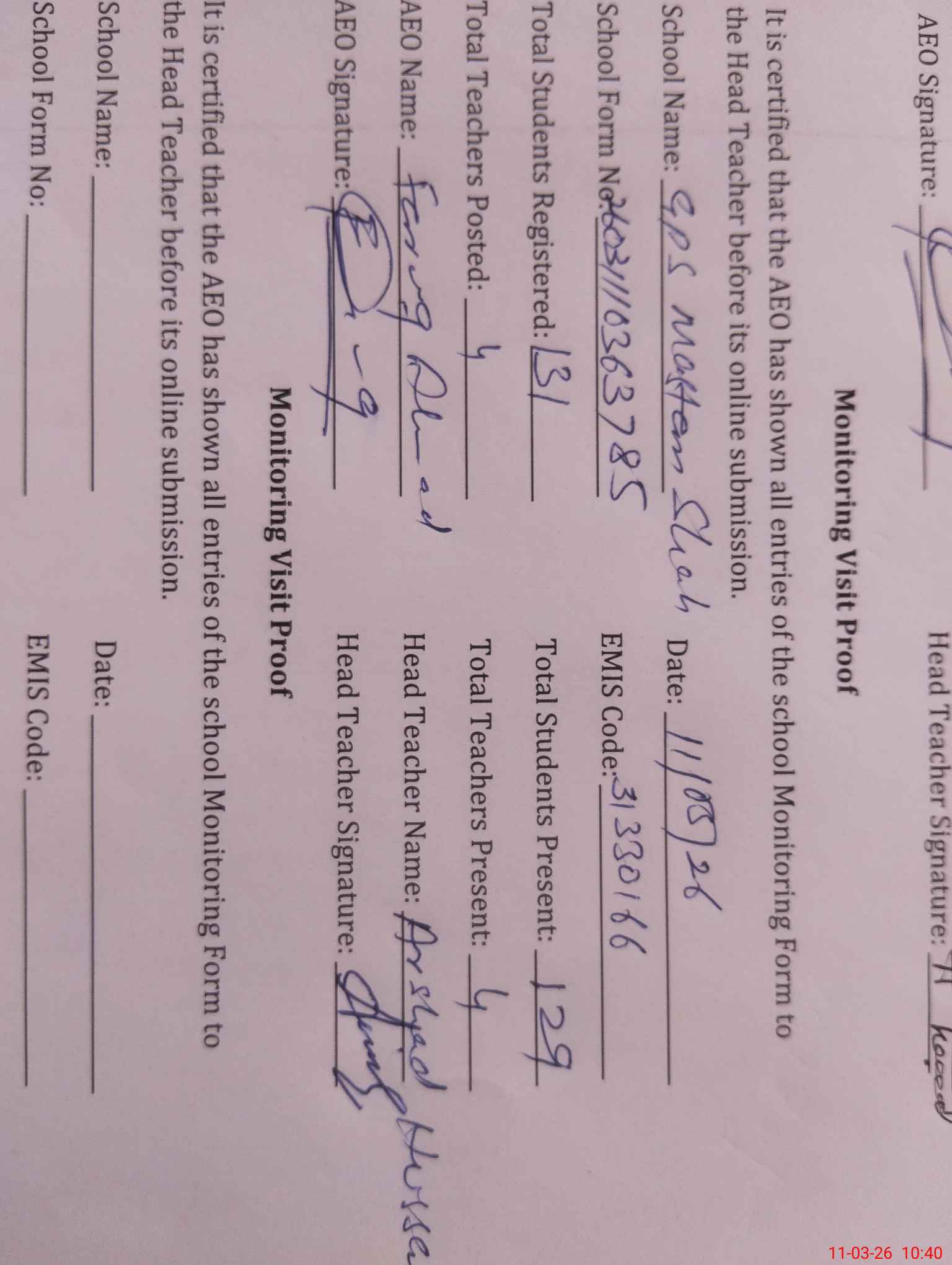 | Attendance Register | Head Teacher | MEA with School | Visit Proof |
