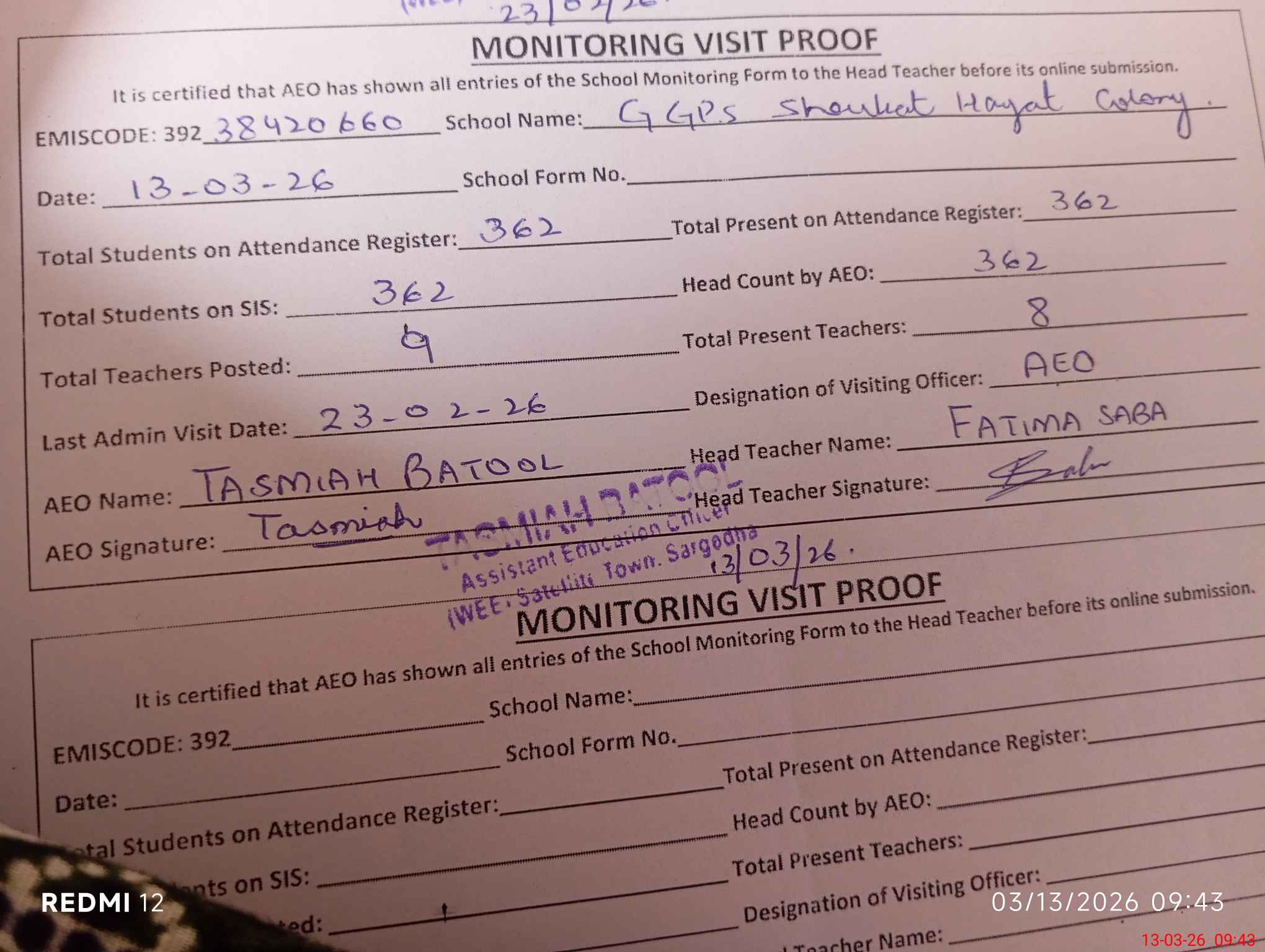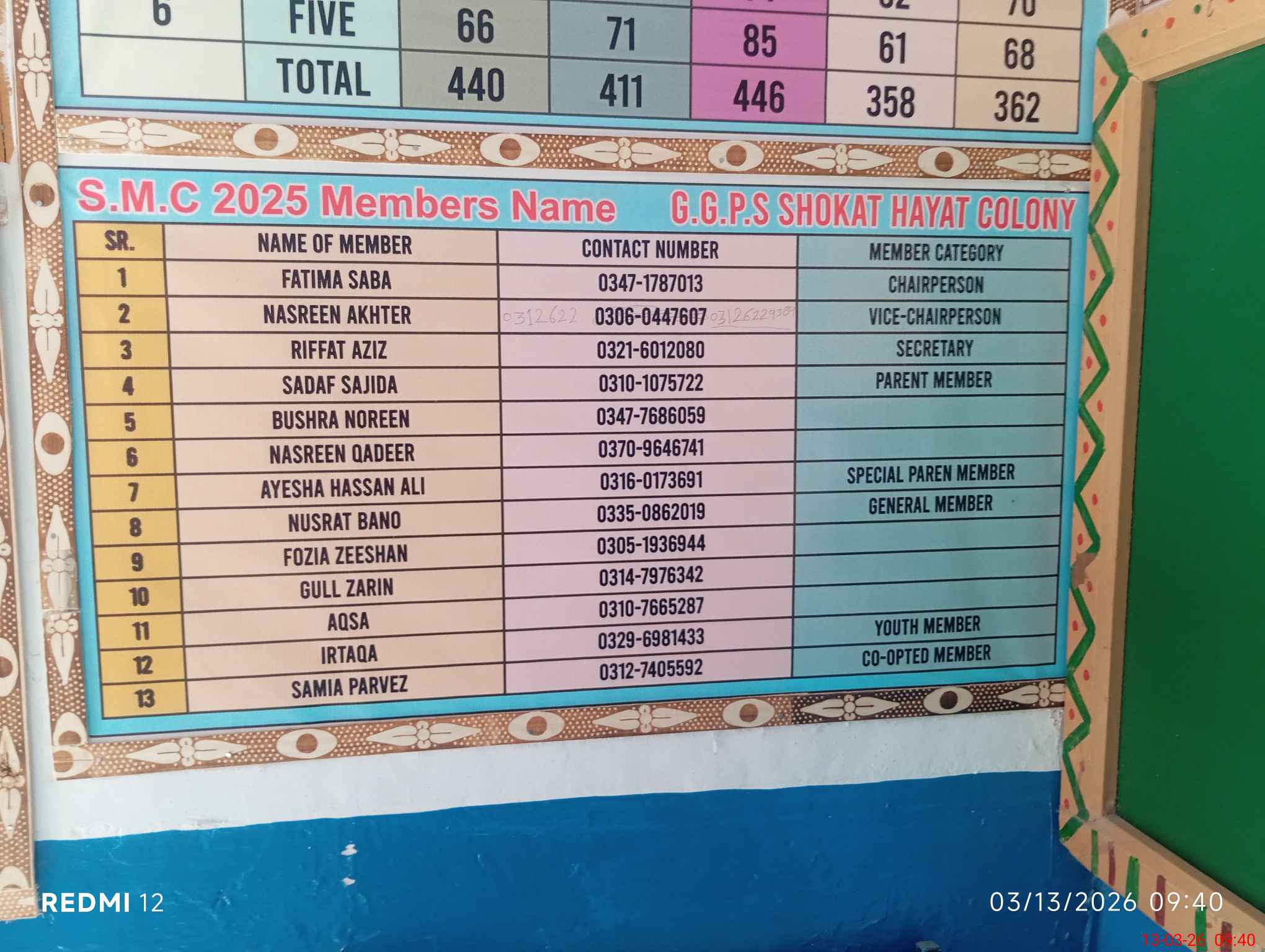 | EMIS Code: 38420660 | Name of School: GGPS SHAUKAT HAYAT COLONY SARGODHA | |||
