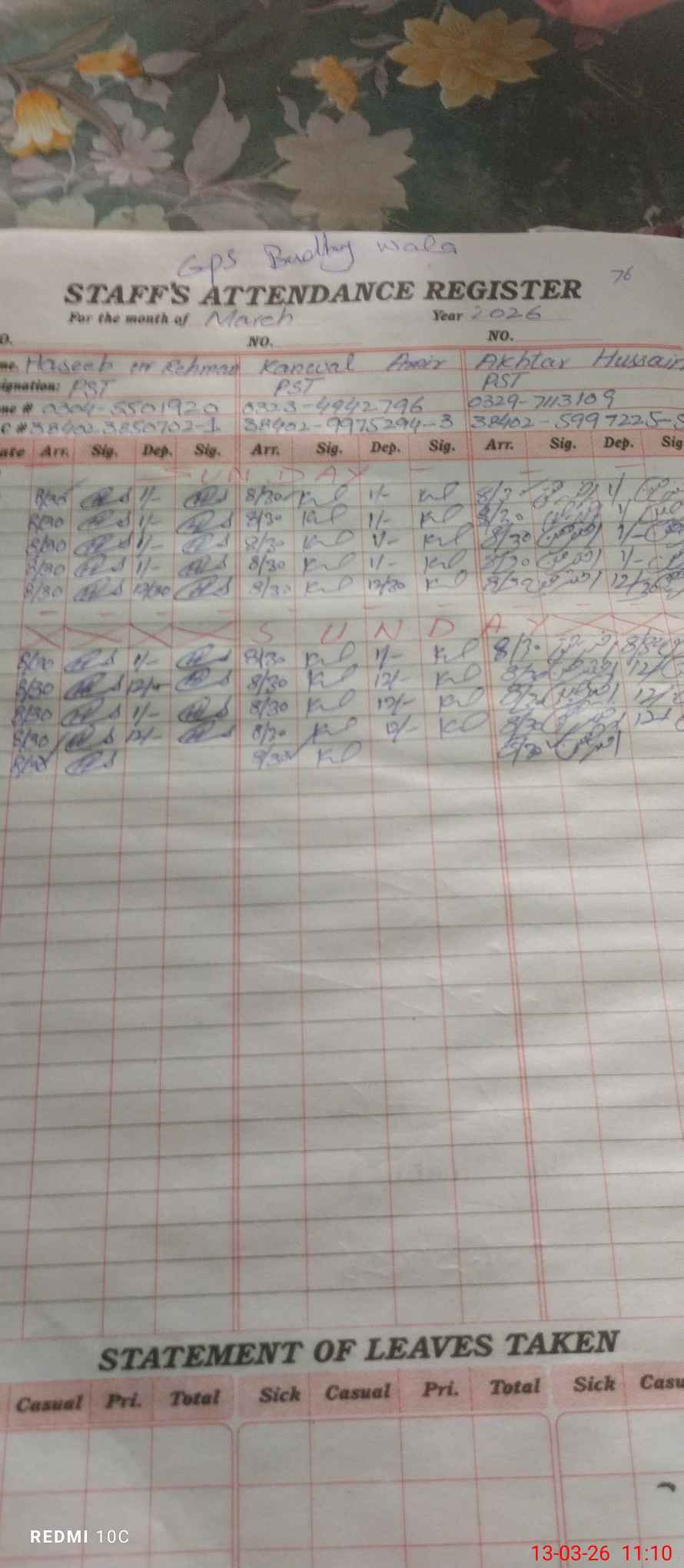 | Name: HA**** URRE**** Designation: (School Headmaster's/Headmistress's) PST Phone/Cell Number: 03**** |