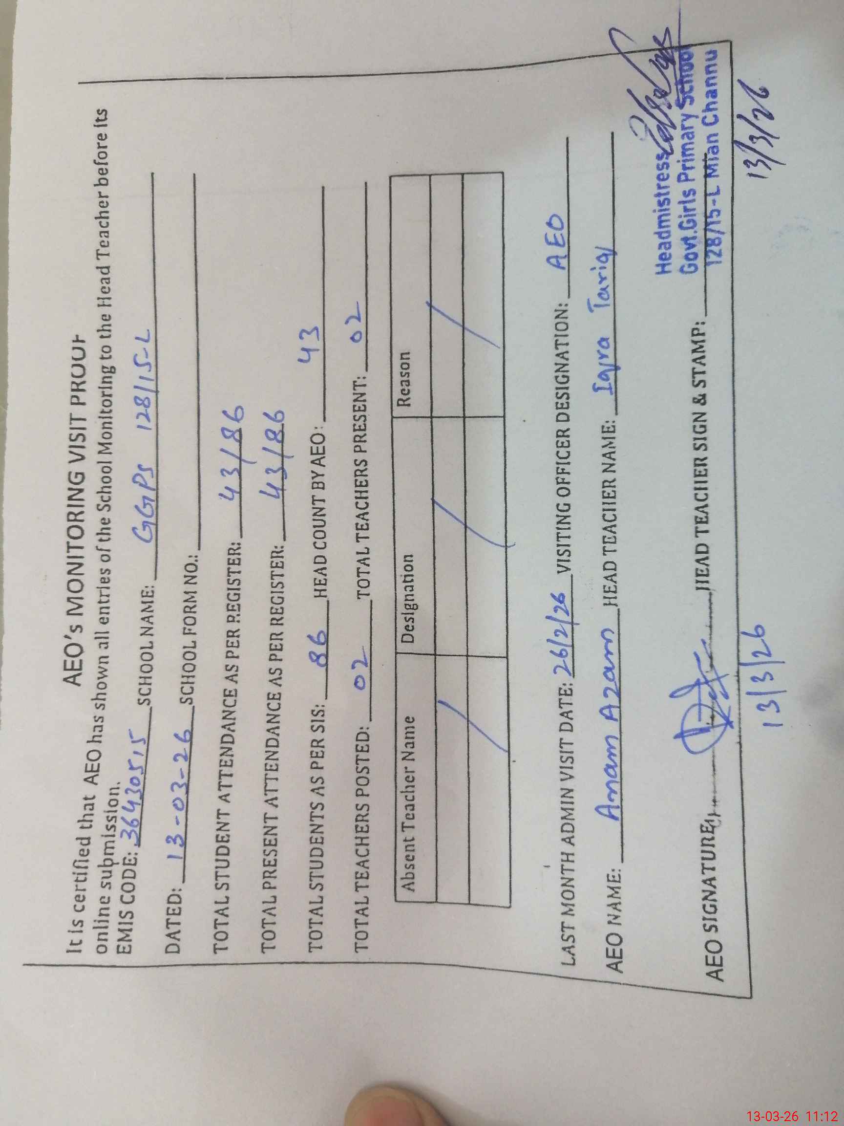 | Name: Iq**** Ta**** Designation: (School Headmaster's/Headmistress's) PST Phone/Cell Number: 03**** |