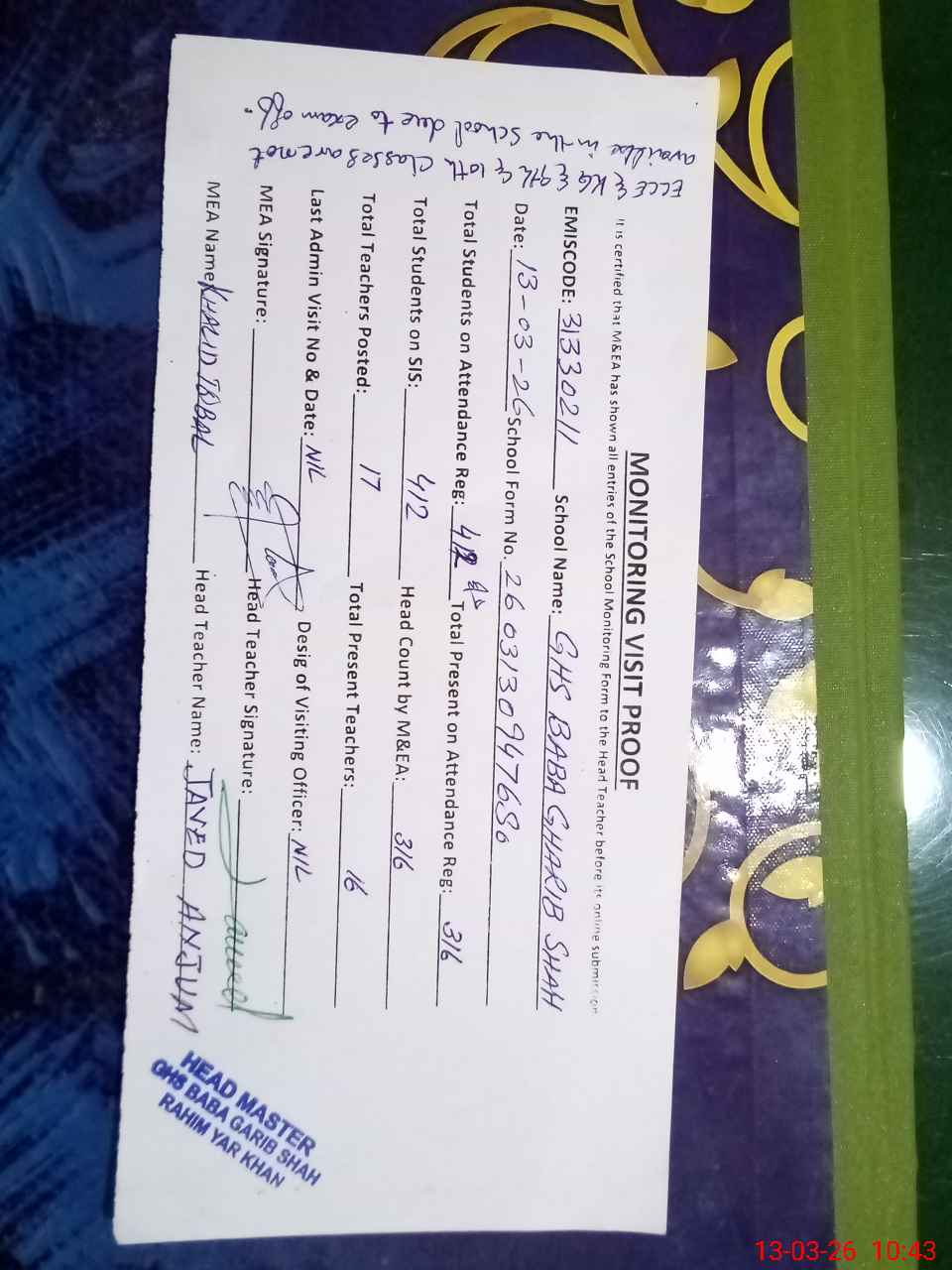 | EMIS Code: 31330211 | Name of School: GHS BABA GHARIB SHAH | |||