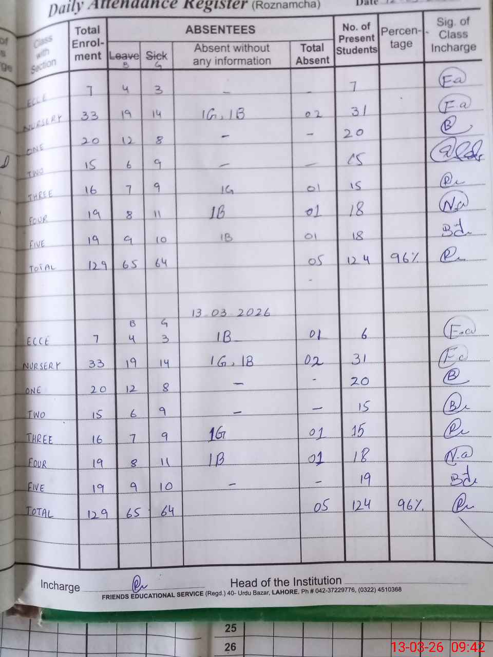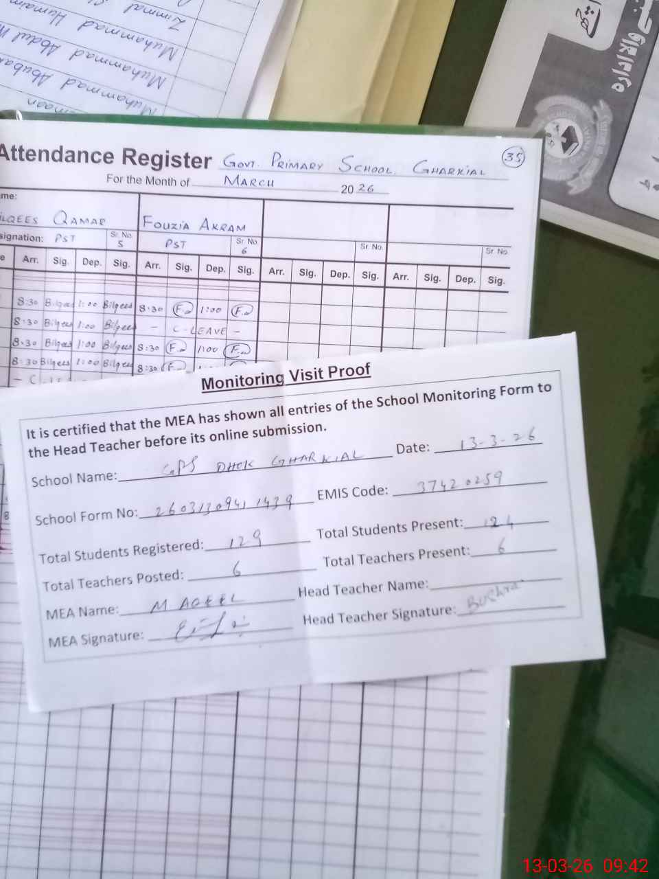 | Attendance Register | Head Teacher | MEA with School | Visit Proof |