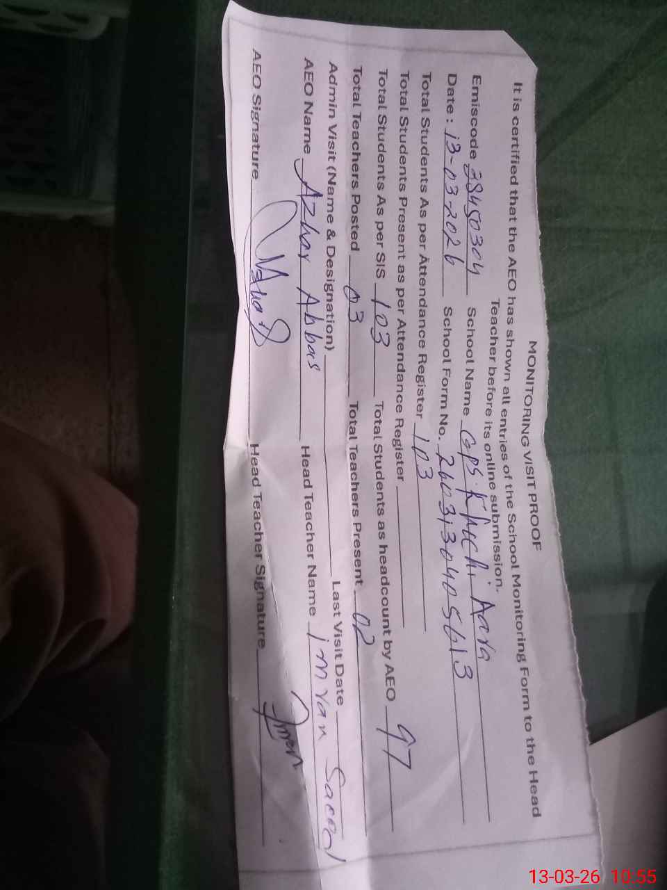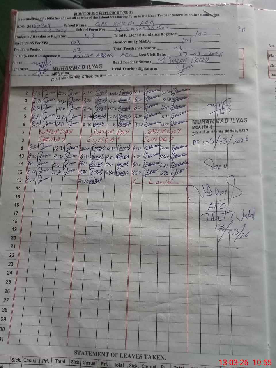 | Attendance Register | Head Teacher | MEA with School | Visit Proof |