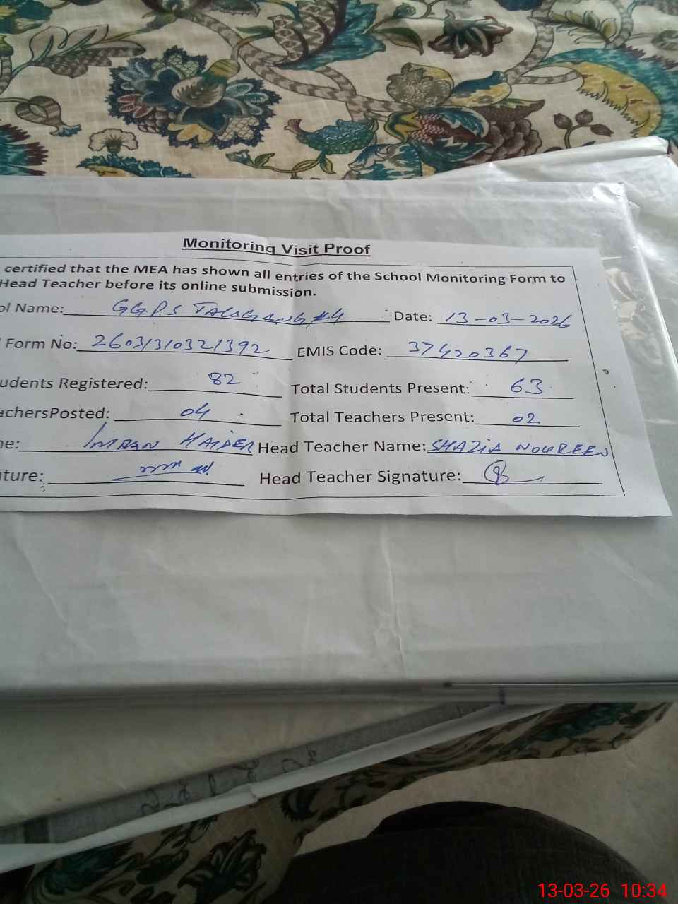 | Attendance Register | Head Teacher | MEA with School | Visit Proof |