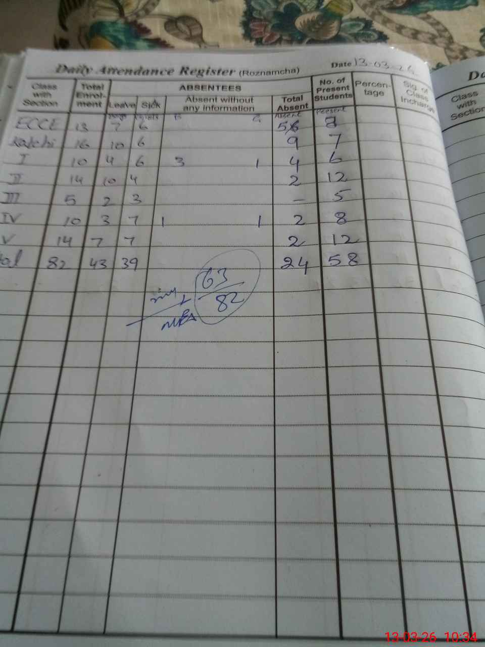 | Total Students Present | 0 | 10 | 8 | 13 | 5 | 8 | 12 | 63 | ||||||||