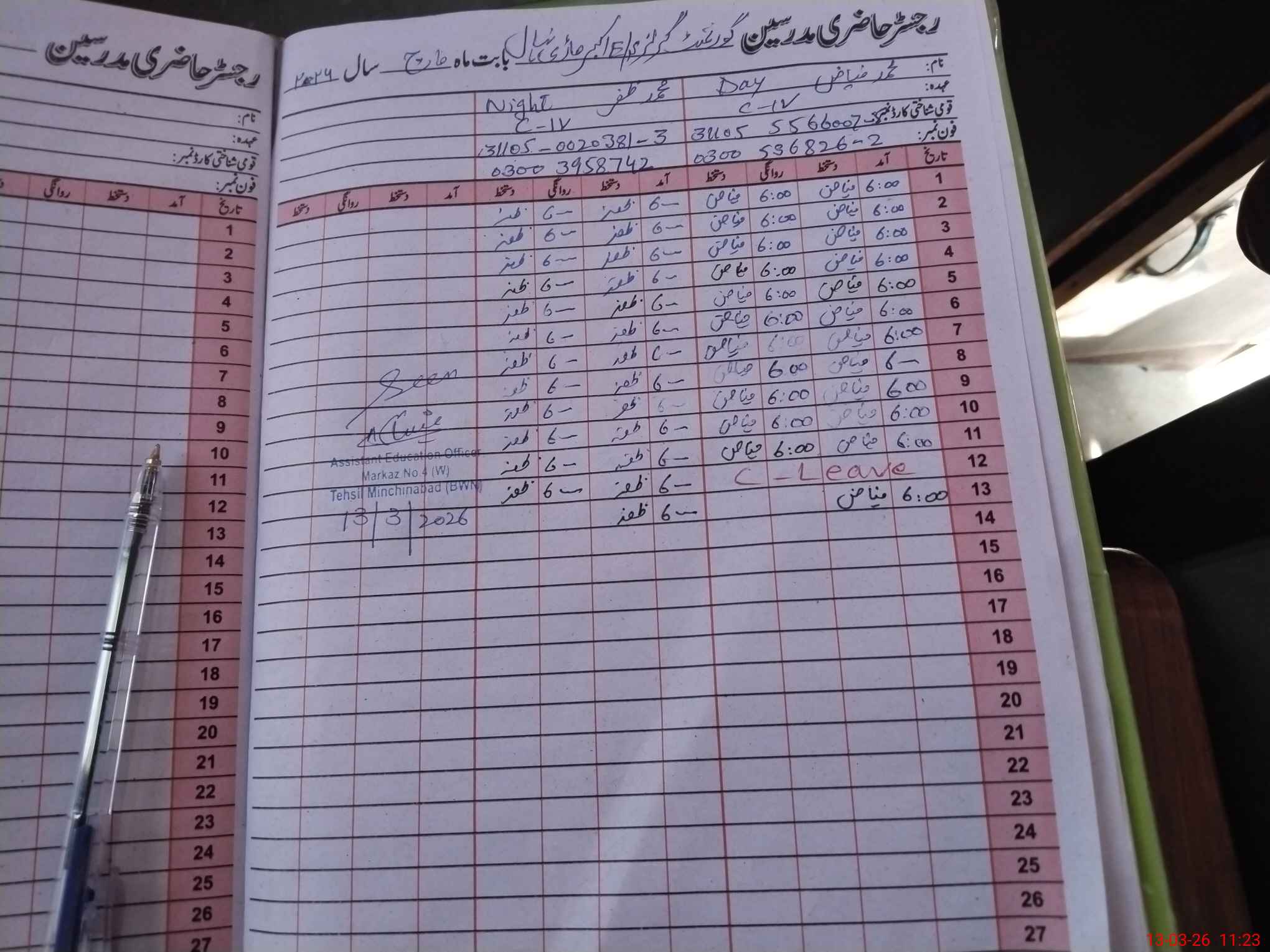 | CNIC | Full Name | Designation | R/C | Absence During Last Calender Month |
