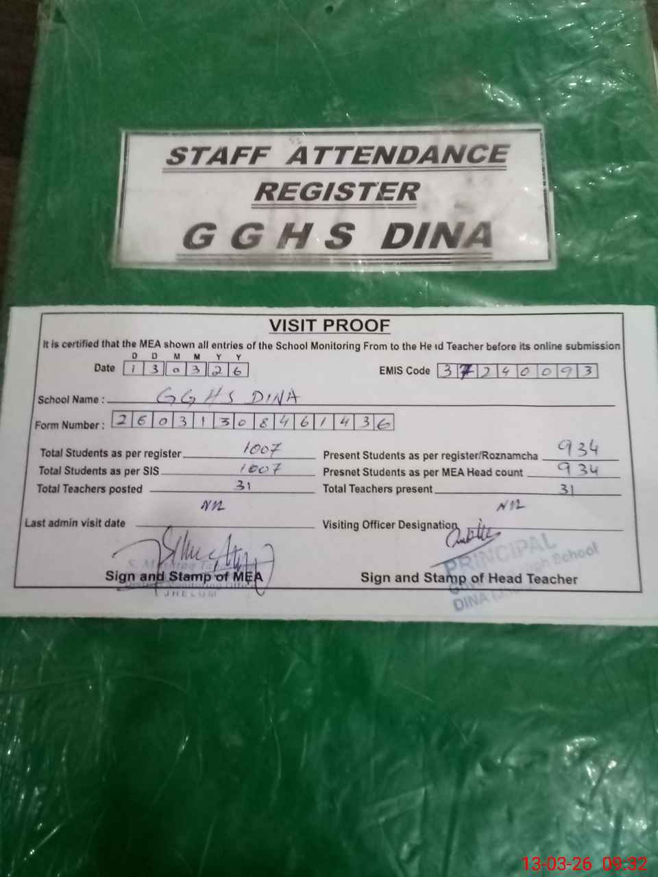 | Attendance Register | Head Teacher | MEA with School | Visit Proof |